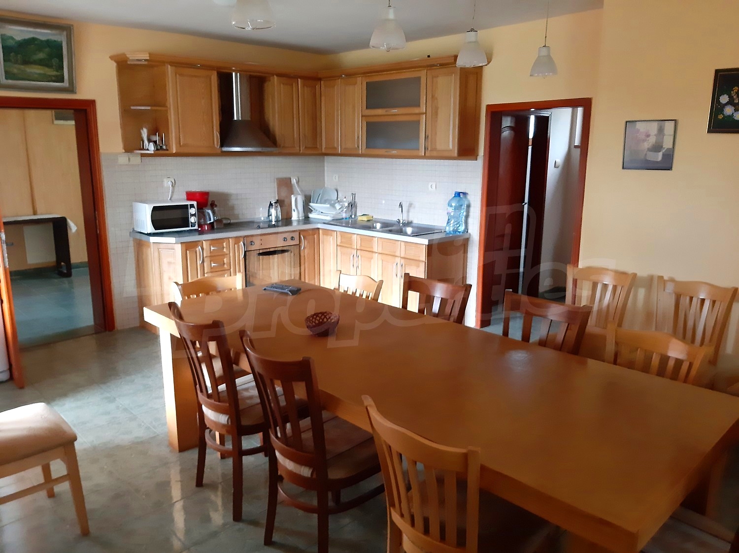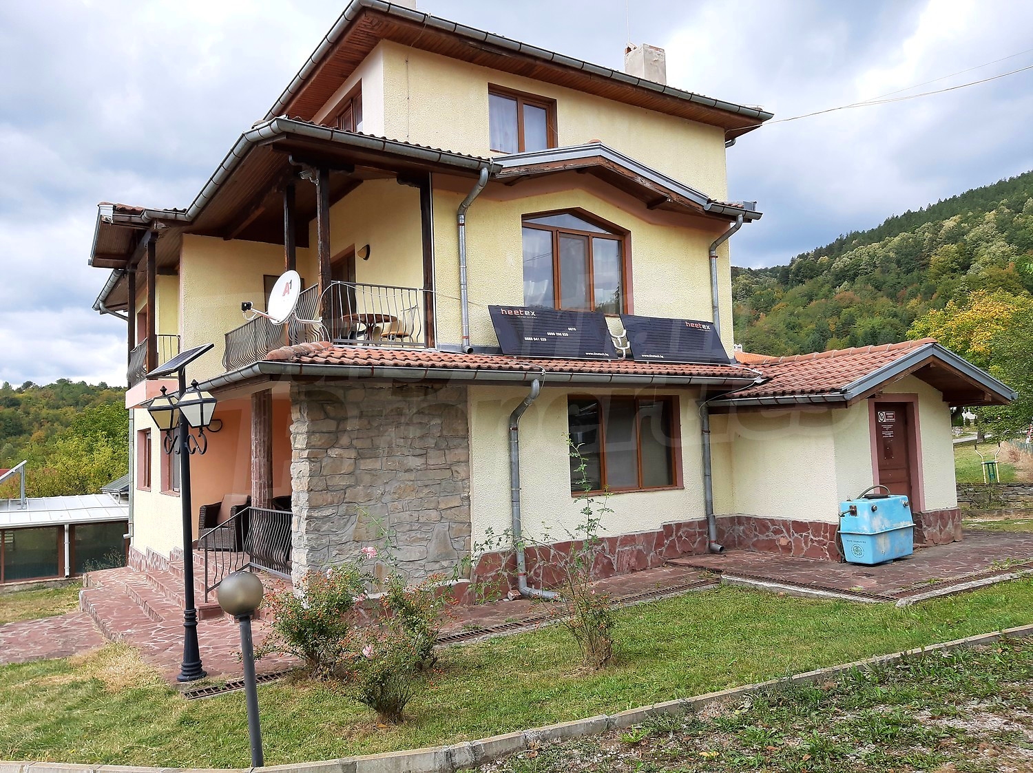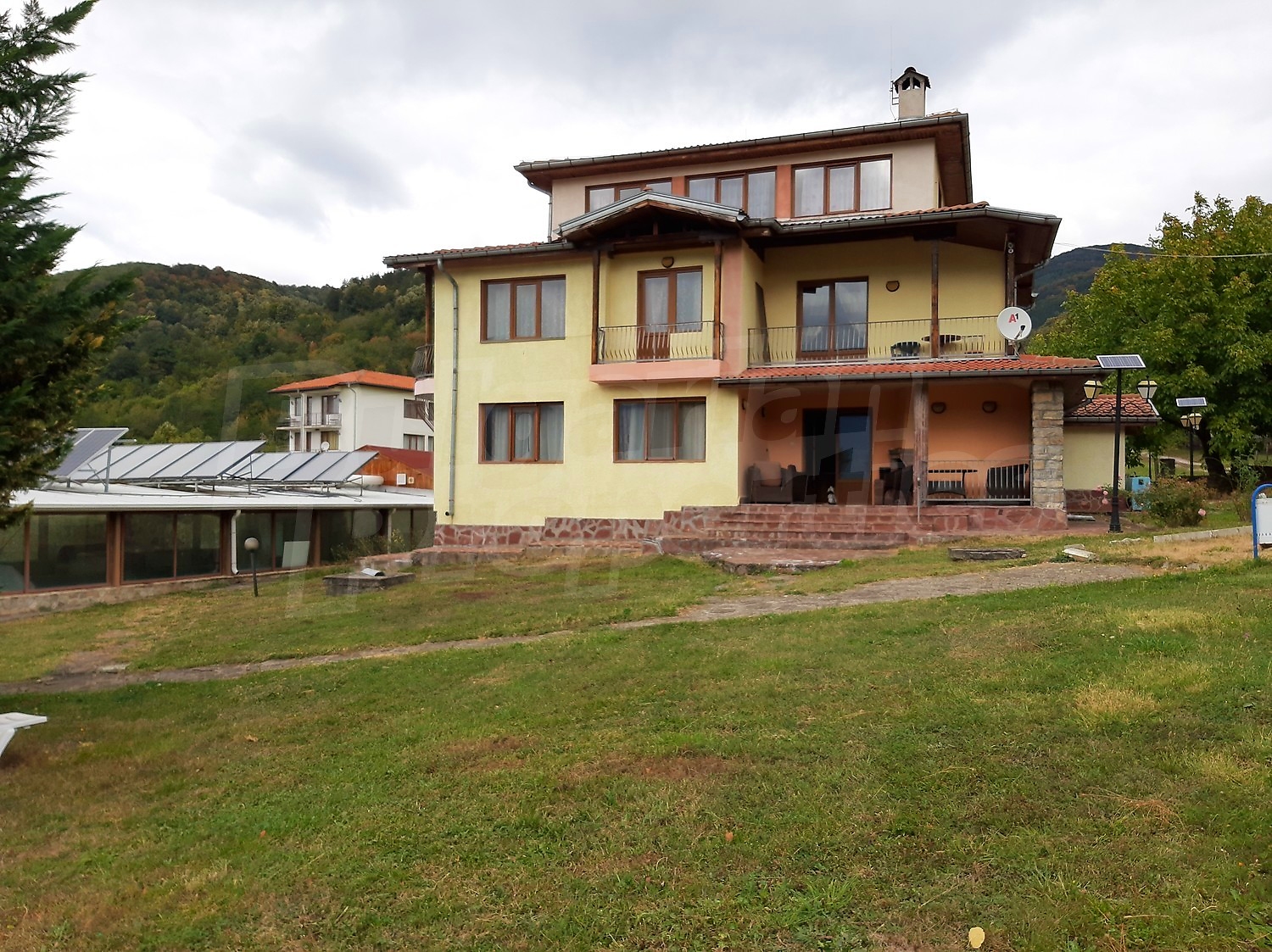 The main building is a solid three-storey structure constructed of reinforced concrete and brick between 2005 and 2012, with a total built-up area of 444 sq.m. It offers a practical layout designed specifically for hospitality use and includes five double rooms with en-suite bathrooms, two apartments, a spacious living area with kitchenette and a garage. The accommodation capacity is up to 20 guests. The property is sold fully furnished and equipped and benefits from local heating via a diesel boiler.