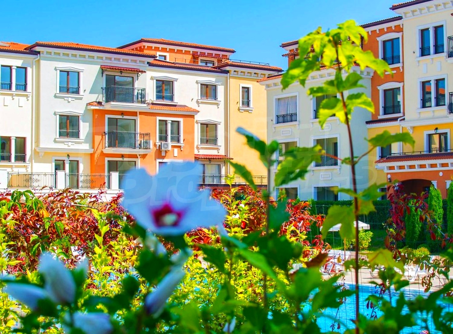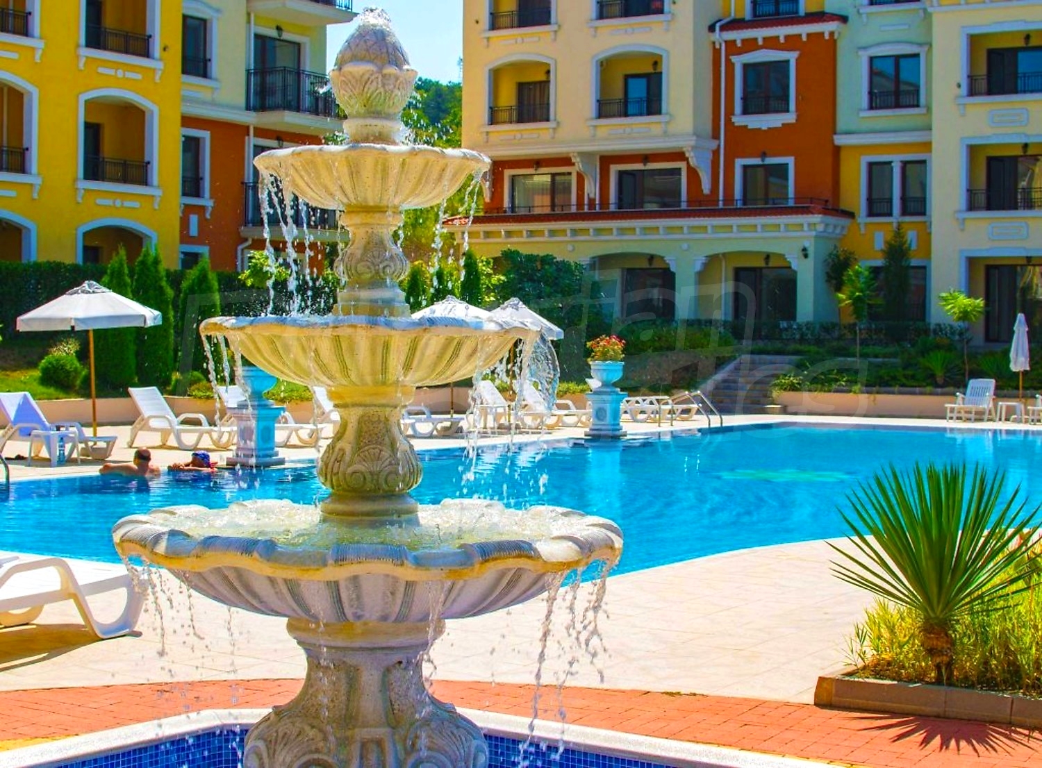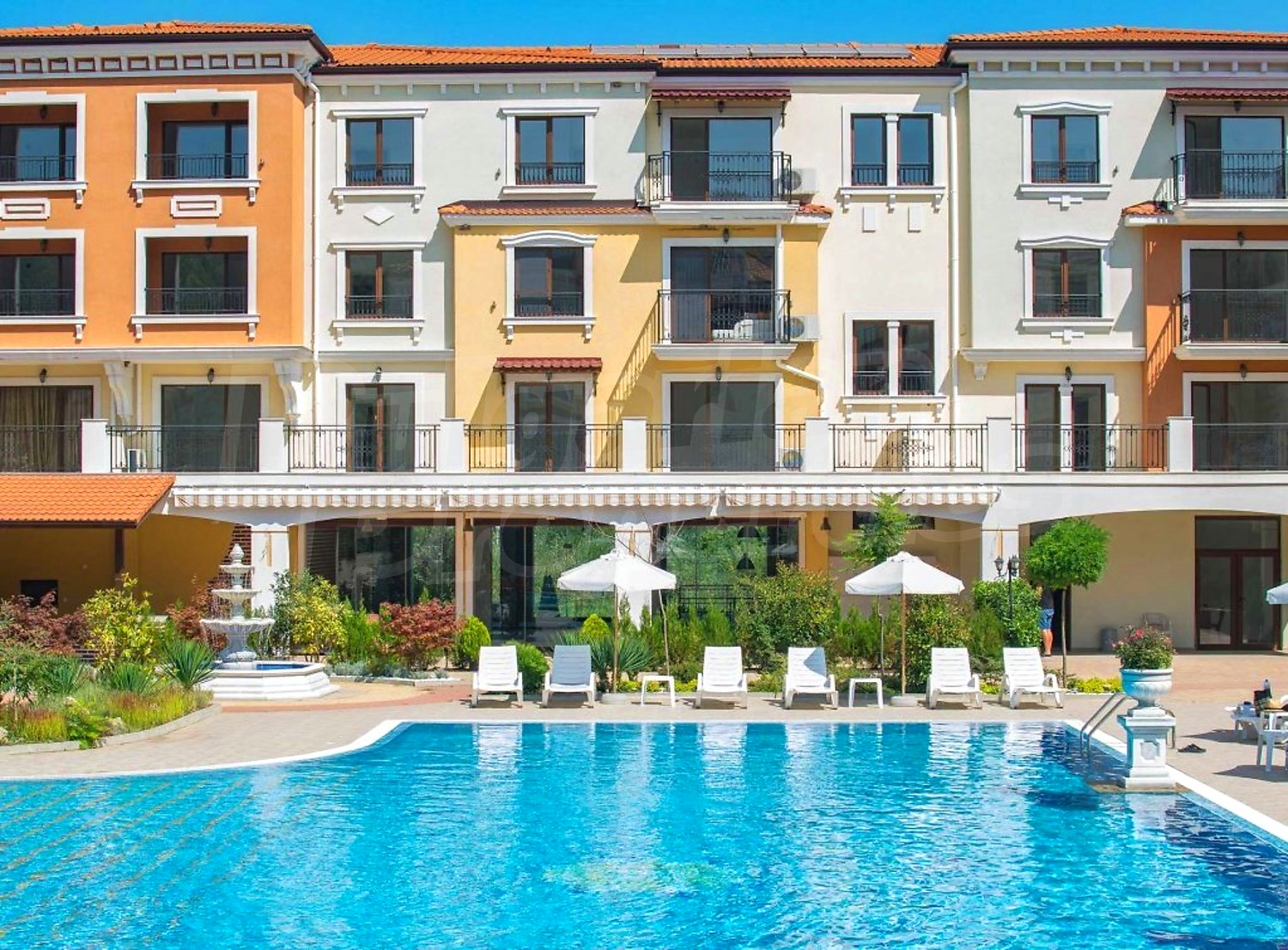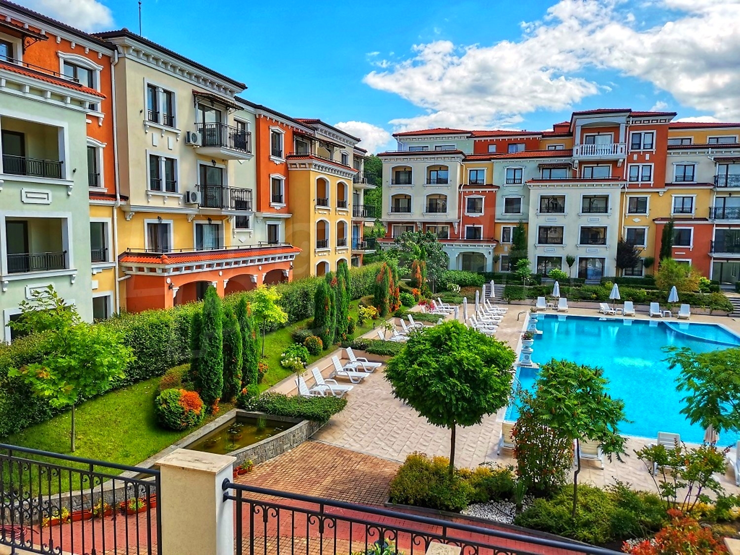 The complex consists of three 4- and 5-storey buildings with elevators, designed in Italian style, with a total area of 7700 sq.m. Available for owners and guests are an outdoor bar, a beautiful 25-meter swimming pool (270 sqm) with a children's section, a children playground, a fitness center and free parking for apartment owners.