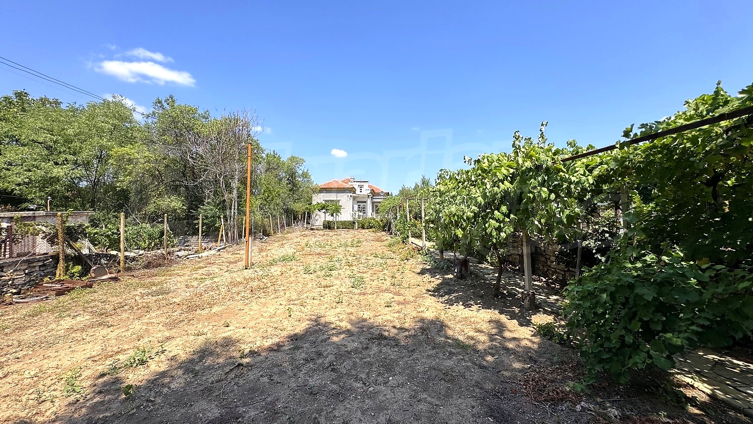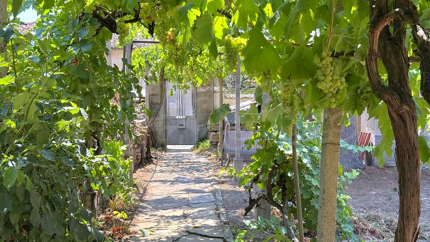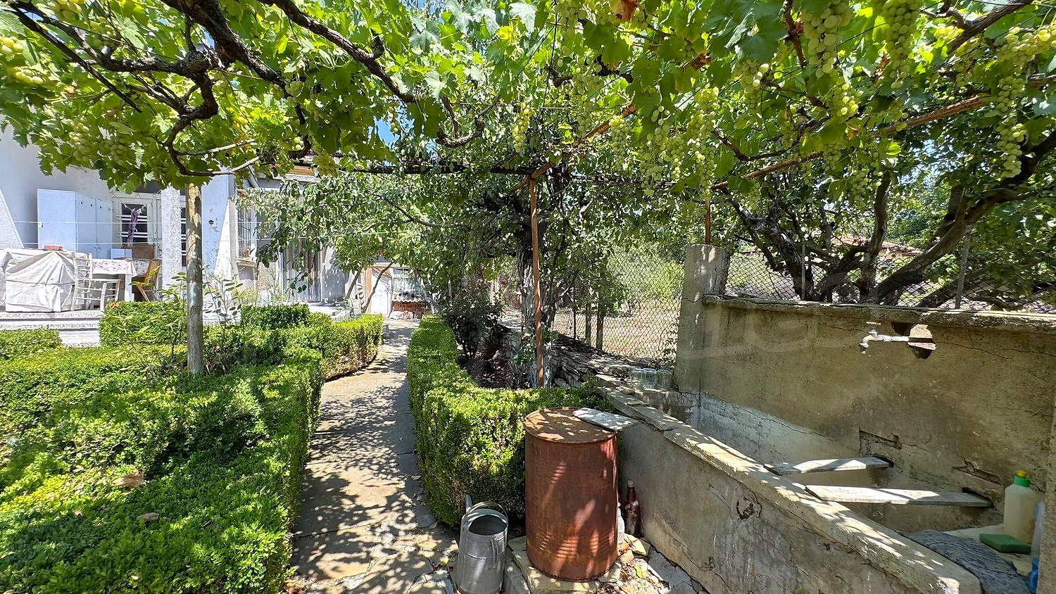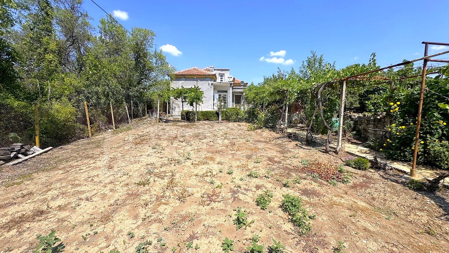 The garden is fenced, planted with fruit trees, flowers, grapes. There is a garage and an open space for parking.