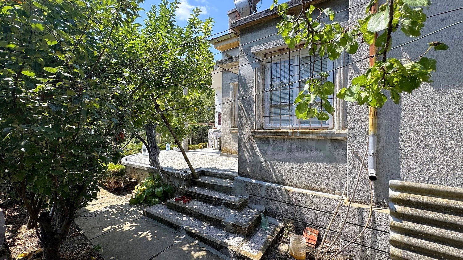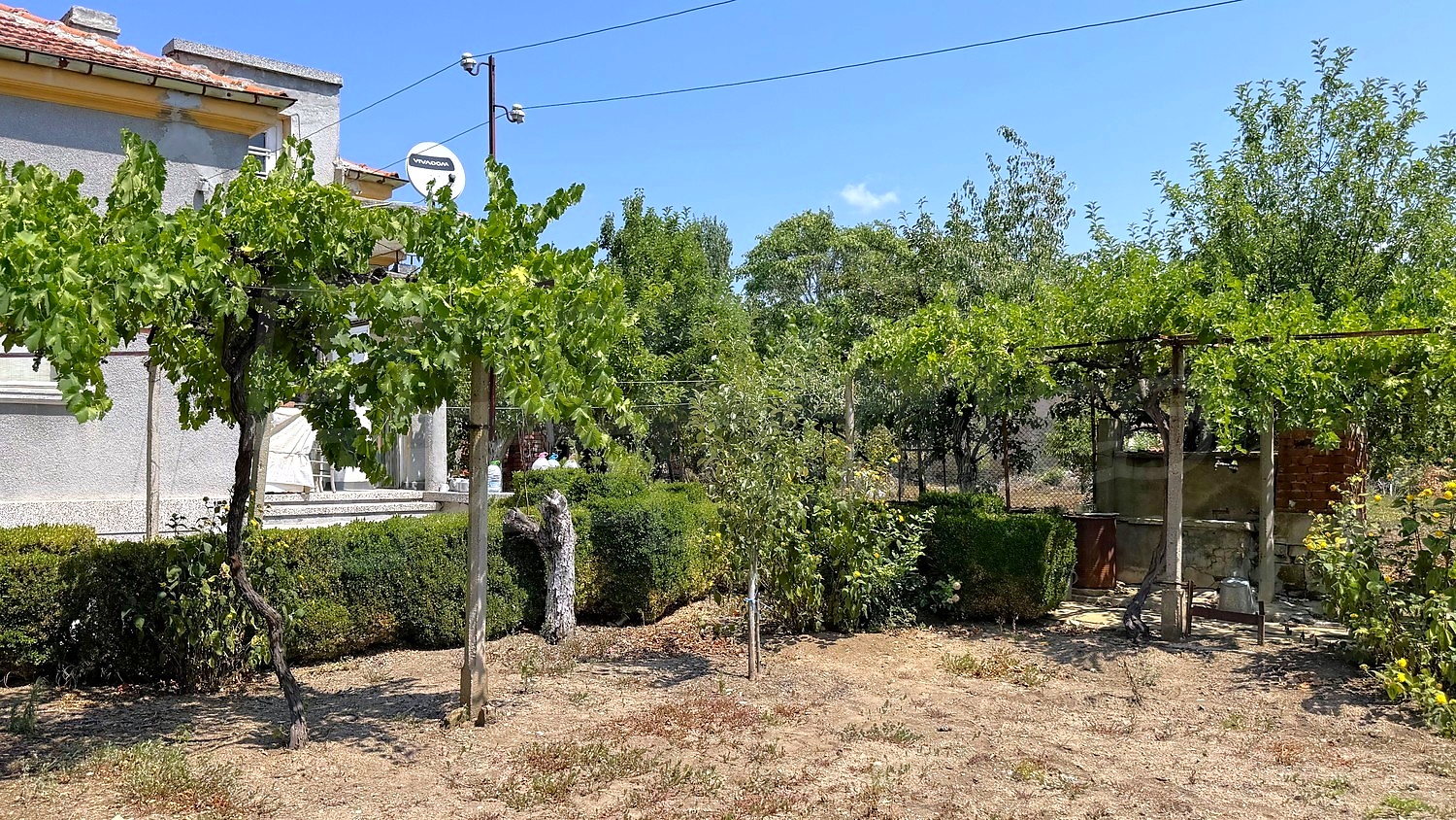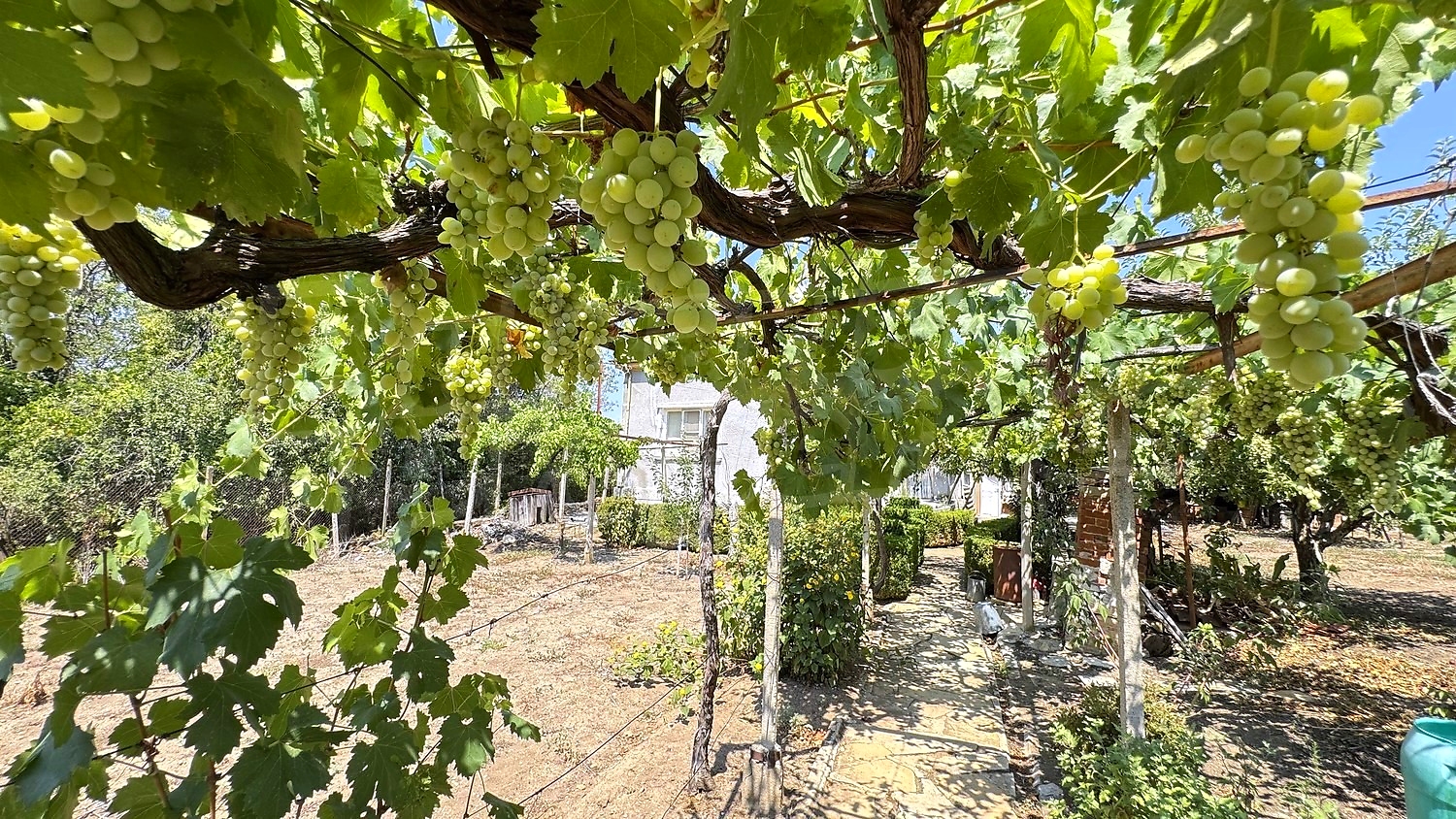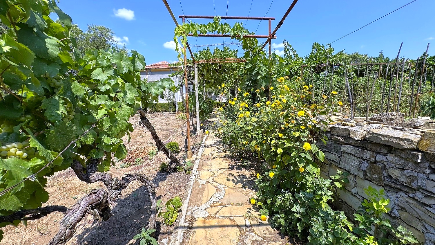 The garden is fenced, planted with fruit trees, flowers, grapes. There is a garage and an open space for parking.