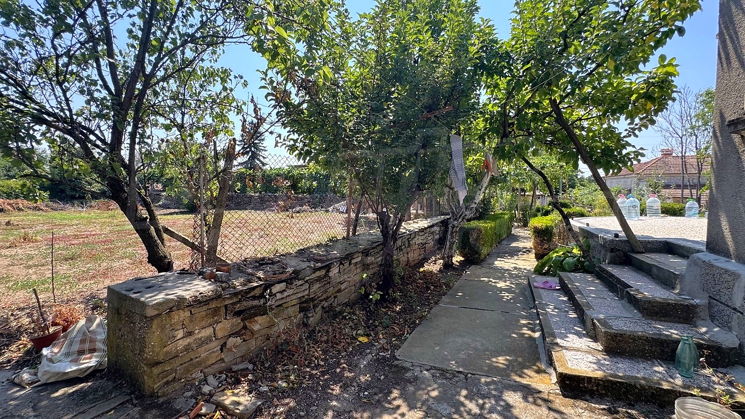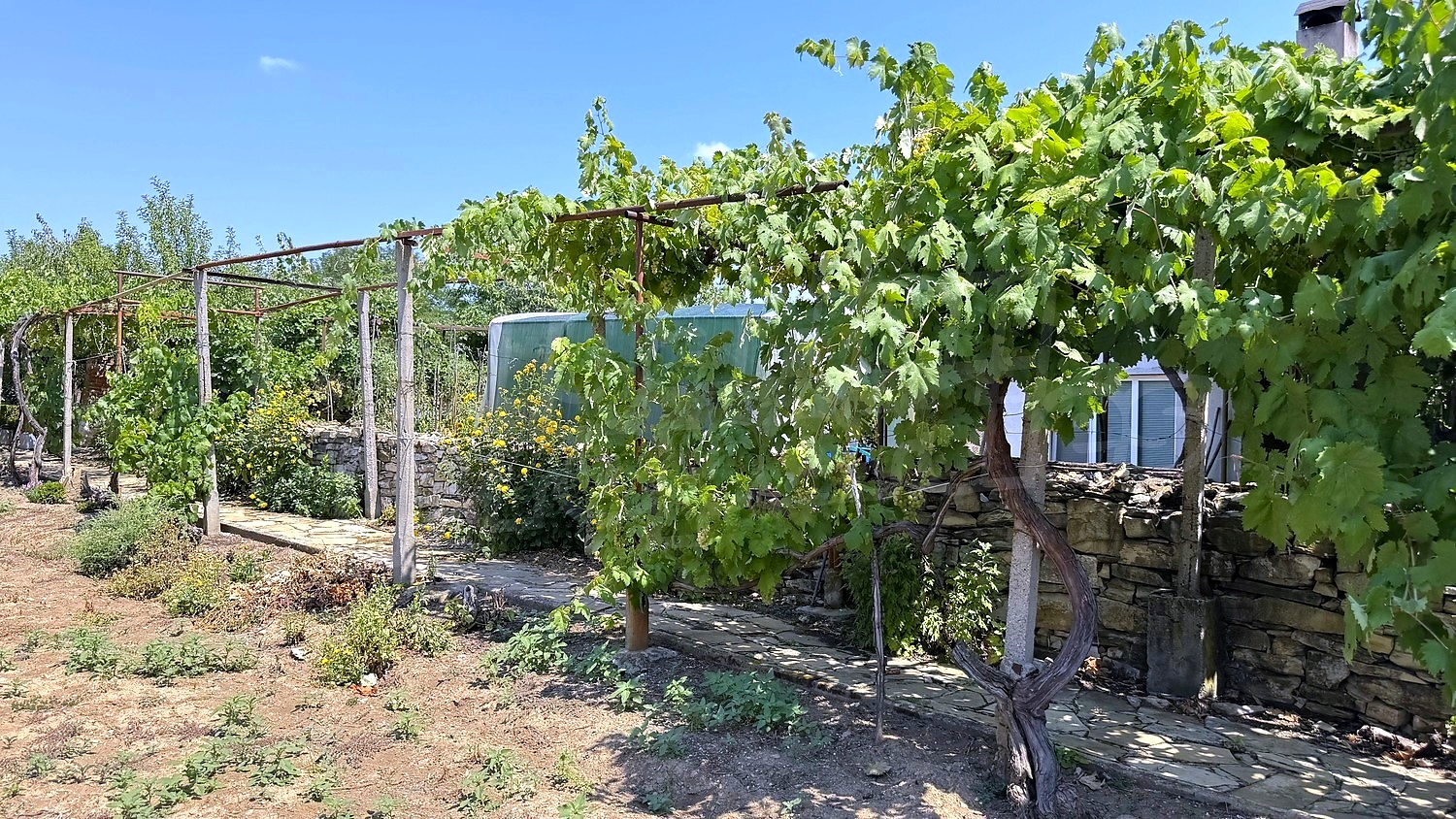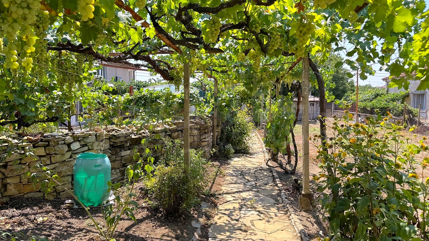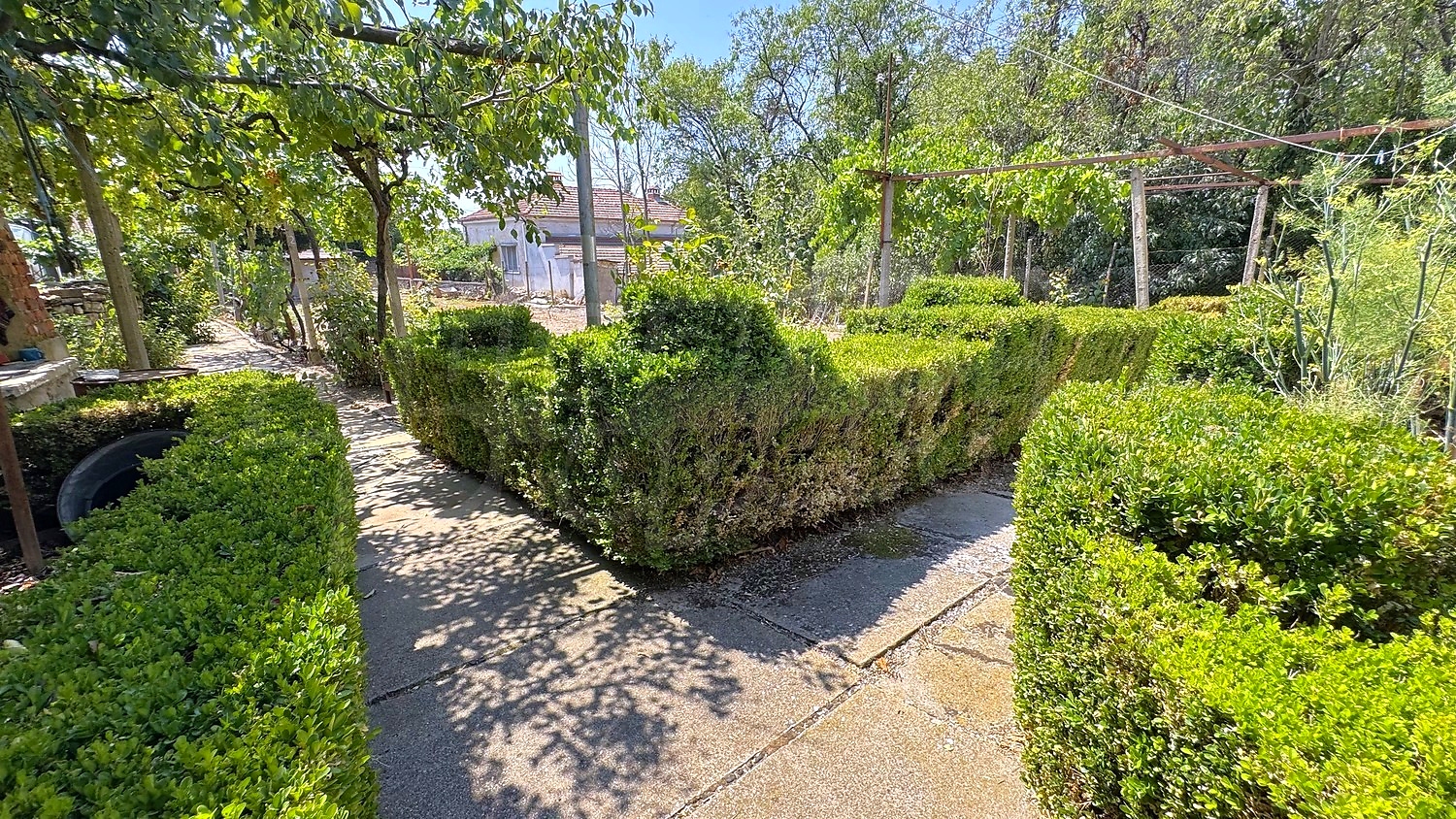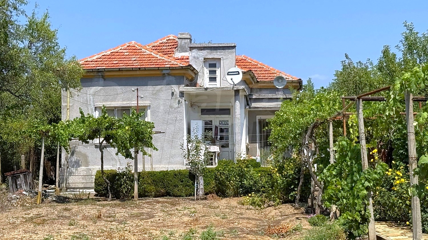 The garden is fenced, planted with fruit trees, flowers, grapes. There is a garage and an open space for parking.
