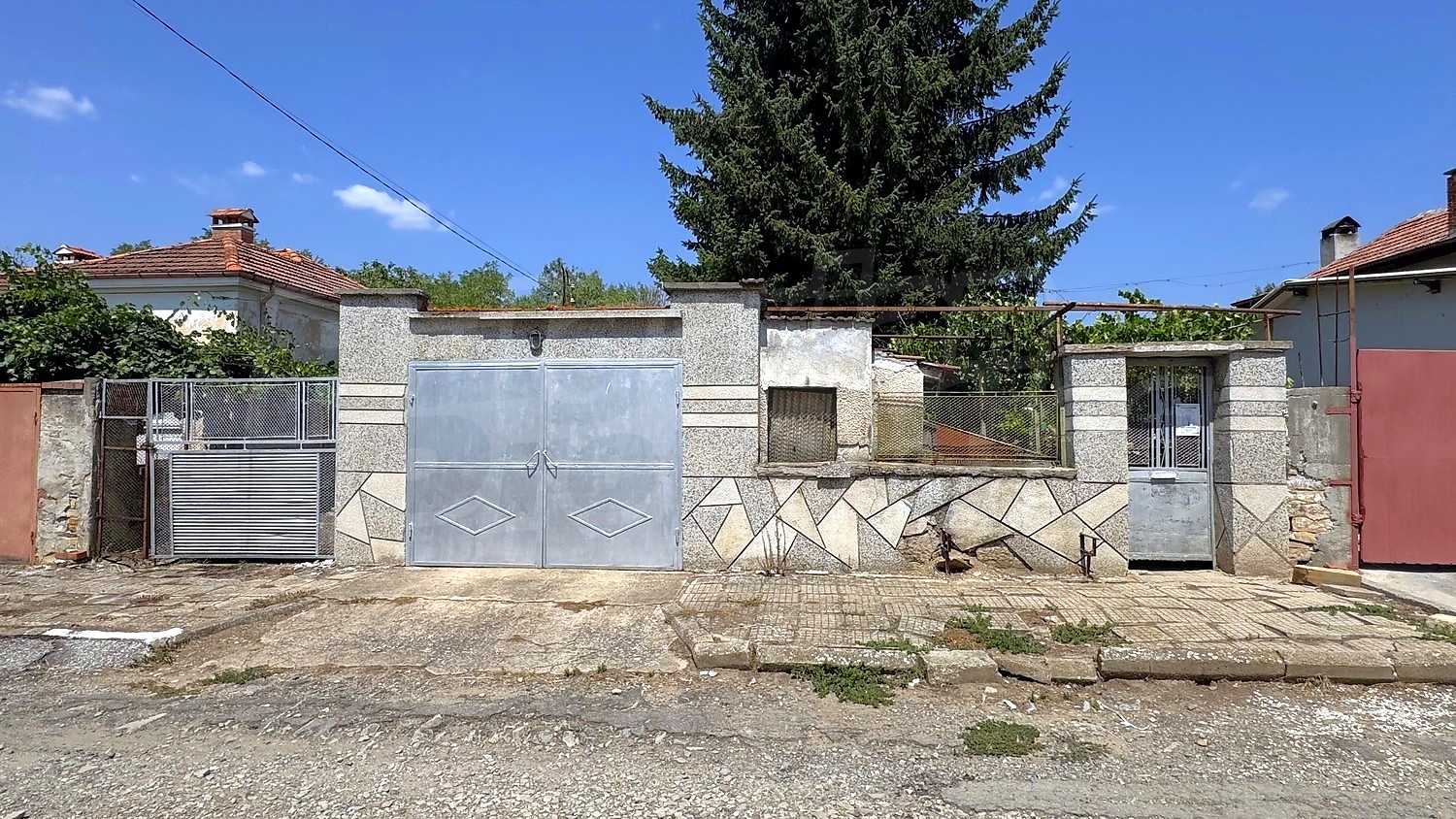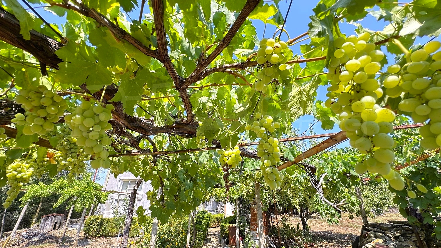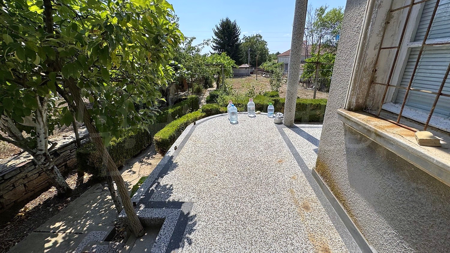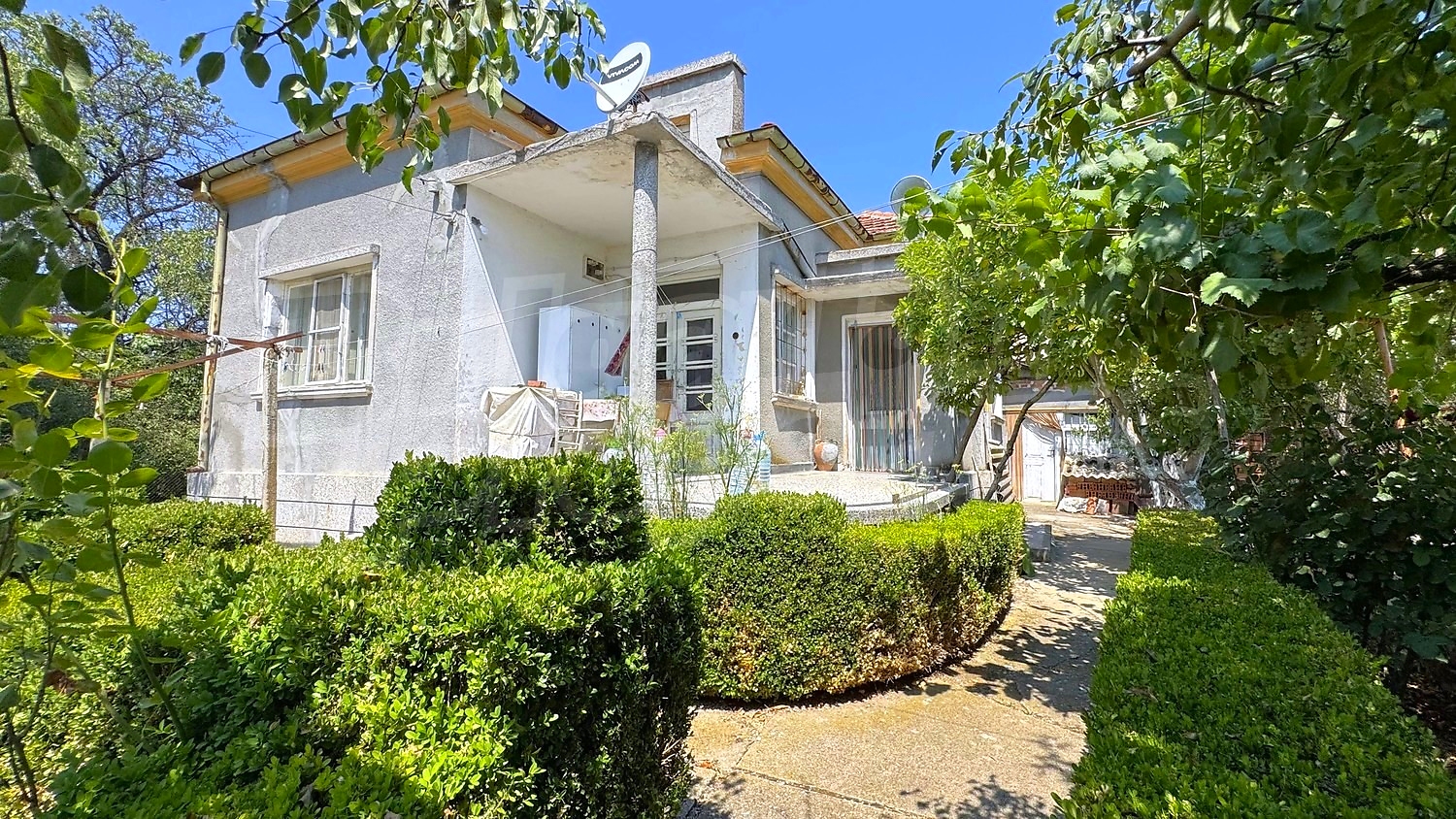 The garden is fenced, planted with fruit trees, flowers, grapes. There is a garage and an open space for parking.