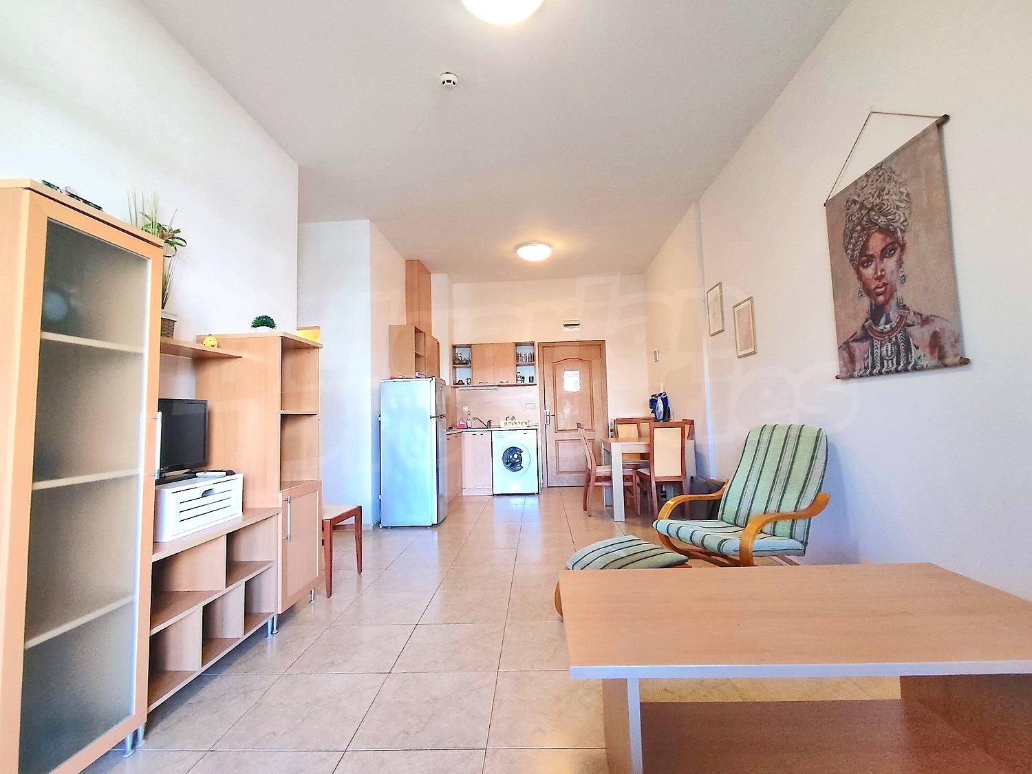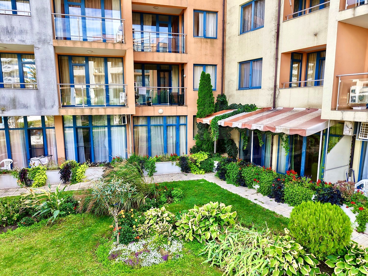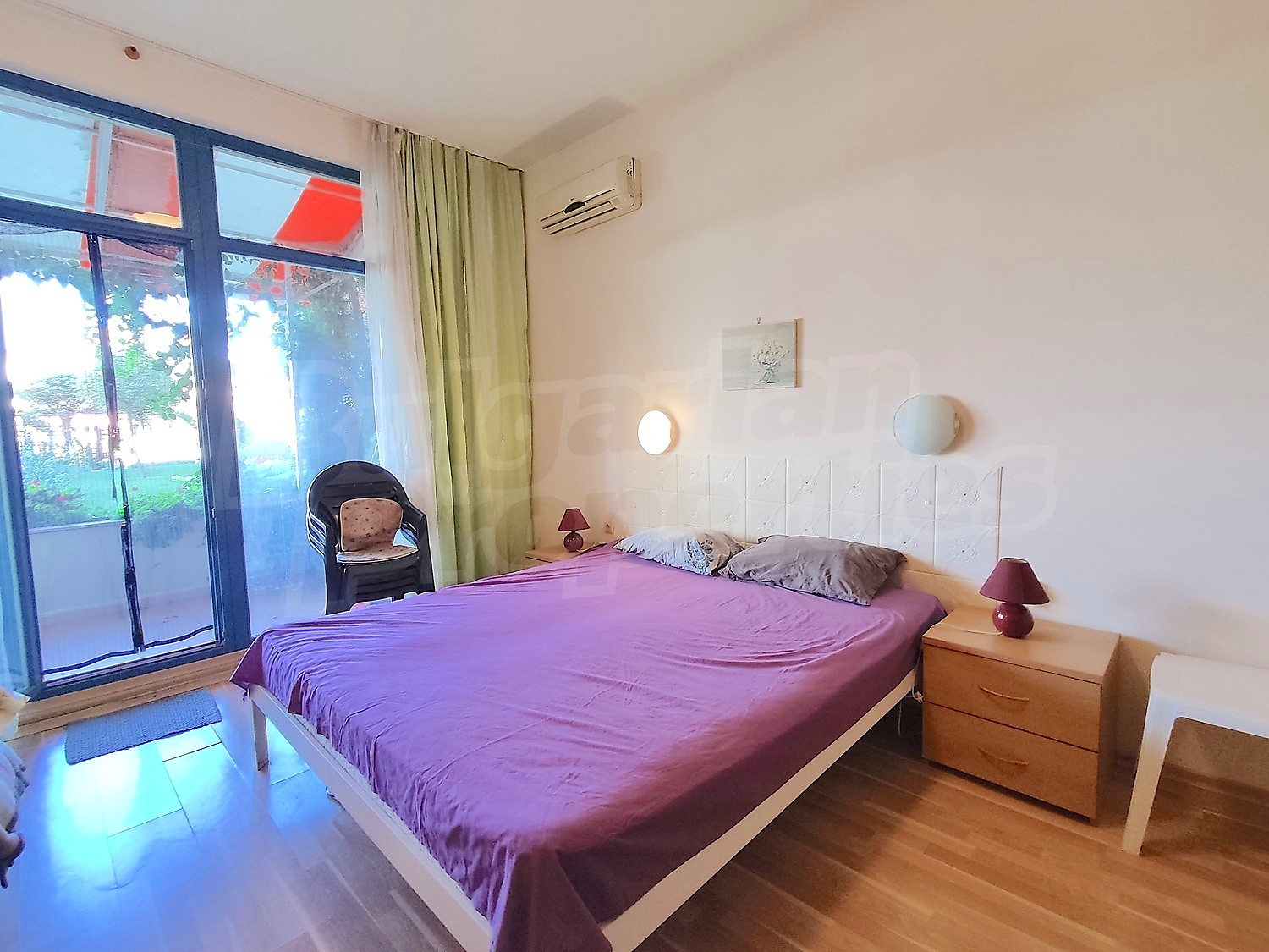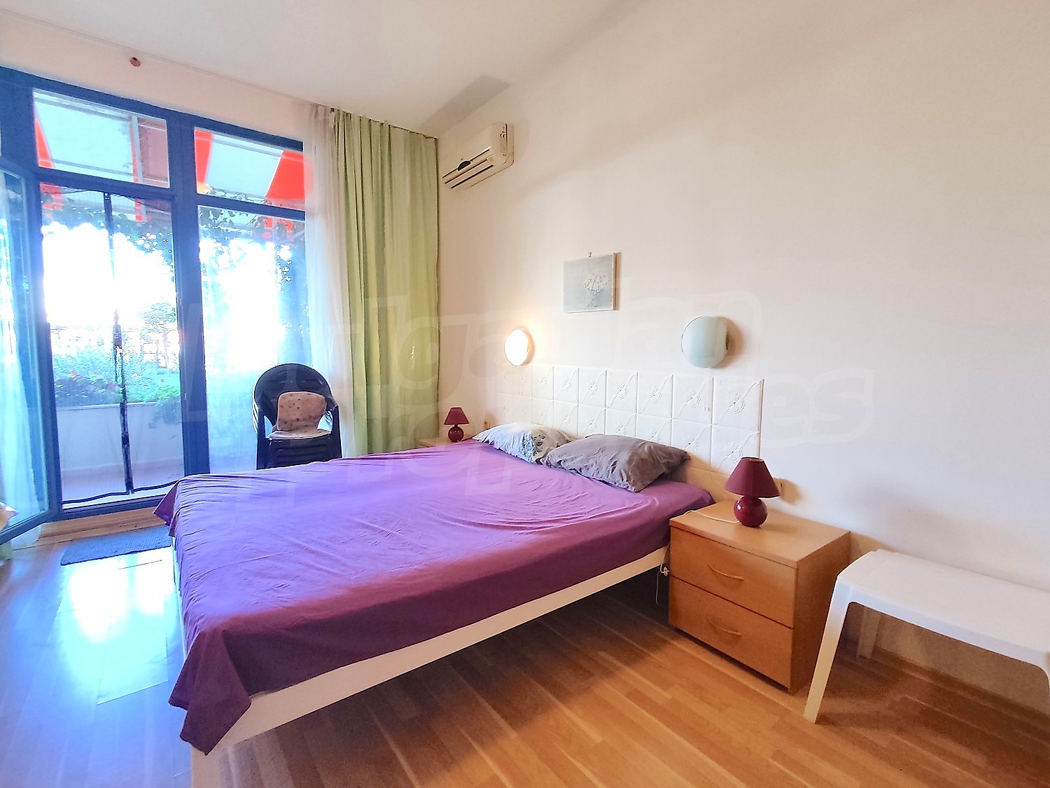 This fully furnished one-bedroom apartment offers 82 sq.m of living space, located on the ground floor of the modern Trakia Apartments complex, only 200 metres from the beach.