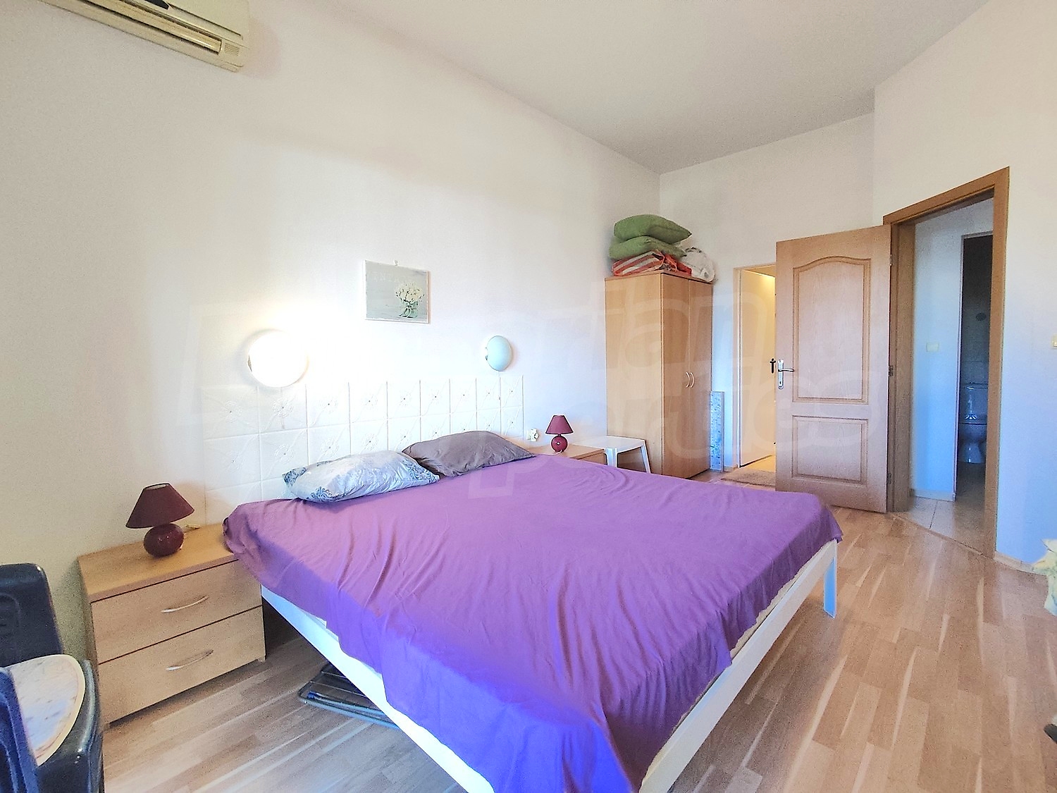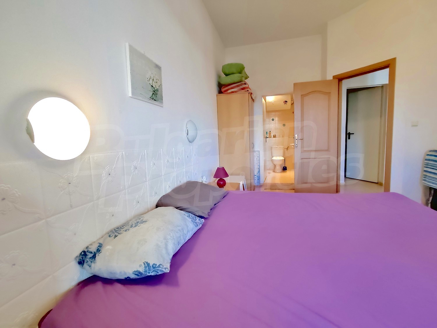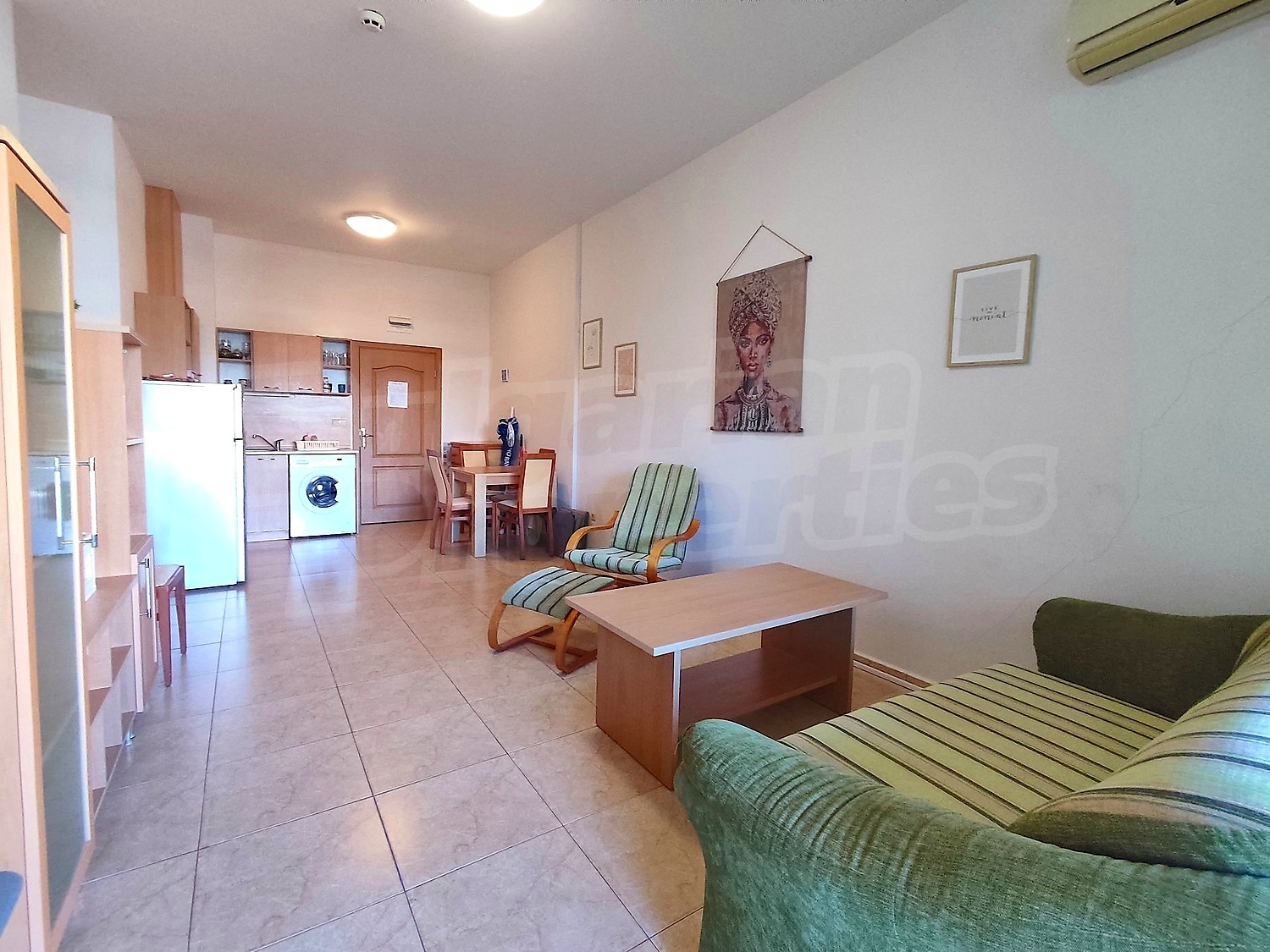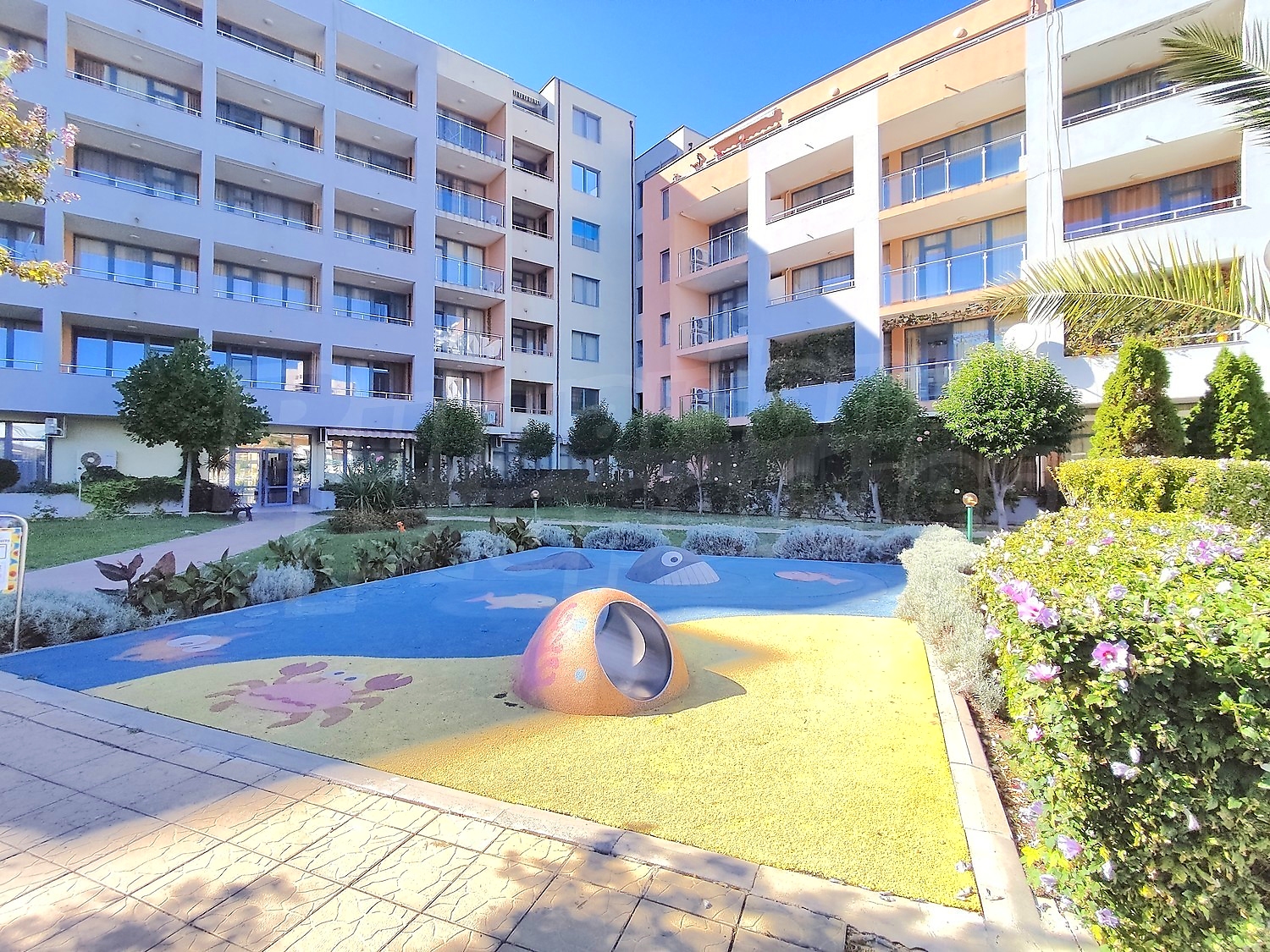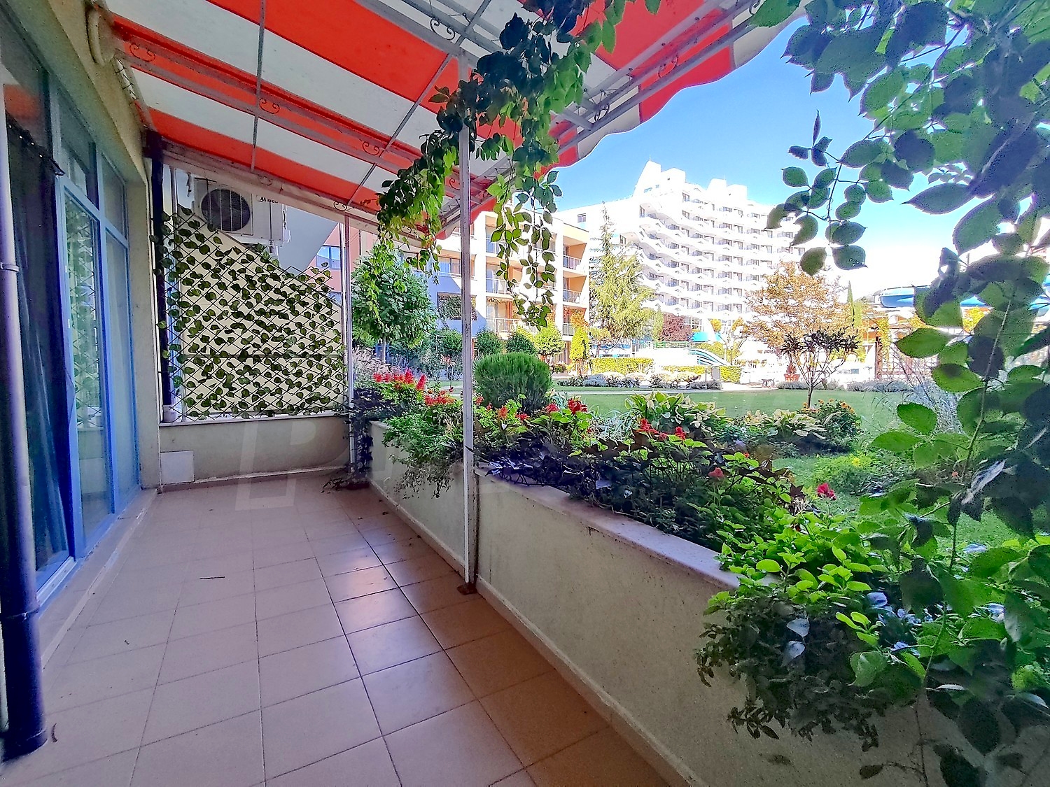 This fully furnished one-bedroom apartment offers 82 sq.m of living space, located on the ground floor of the modern Trakia Apartments complex, only 200 metres from the beach.