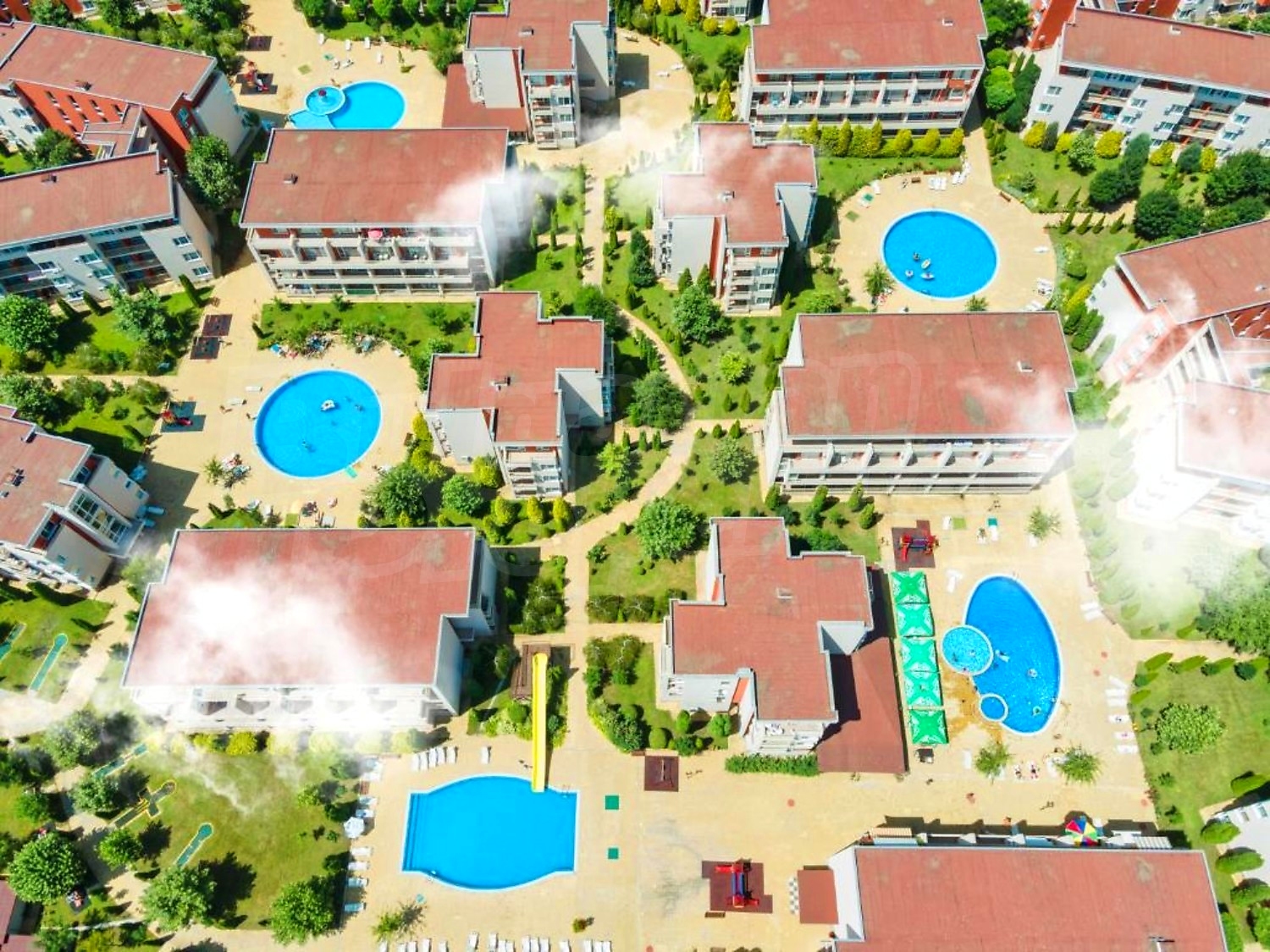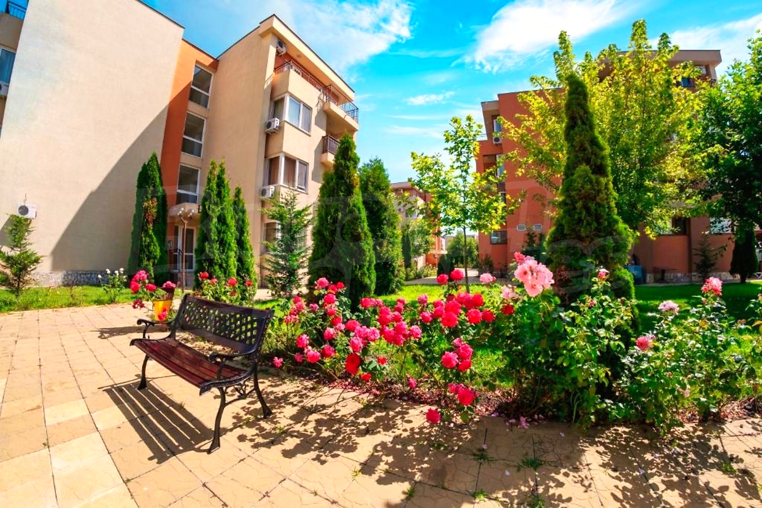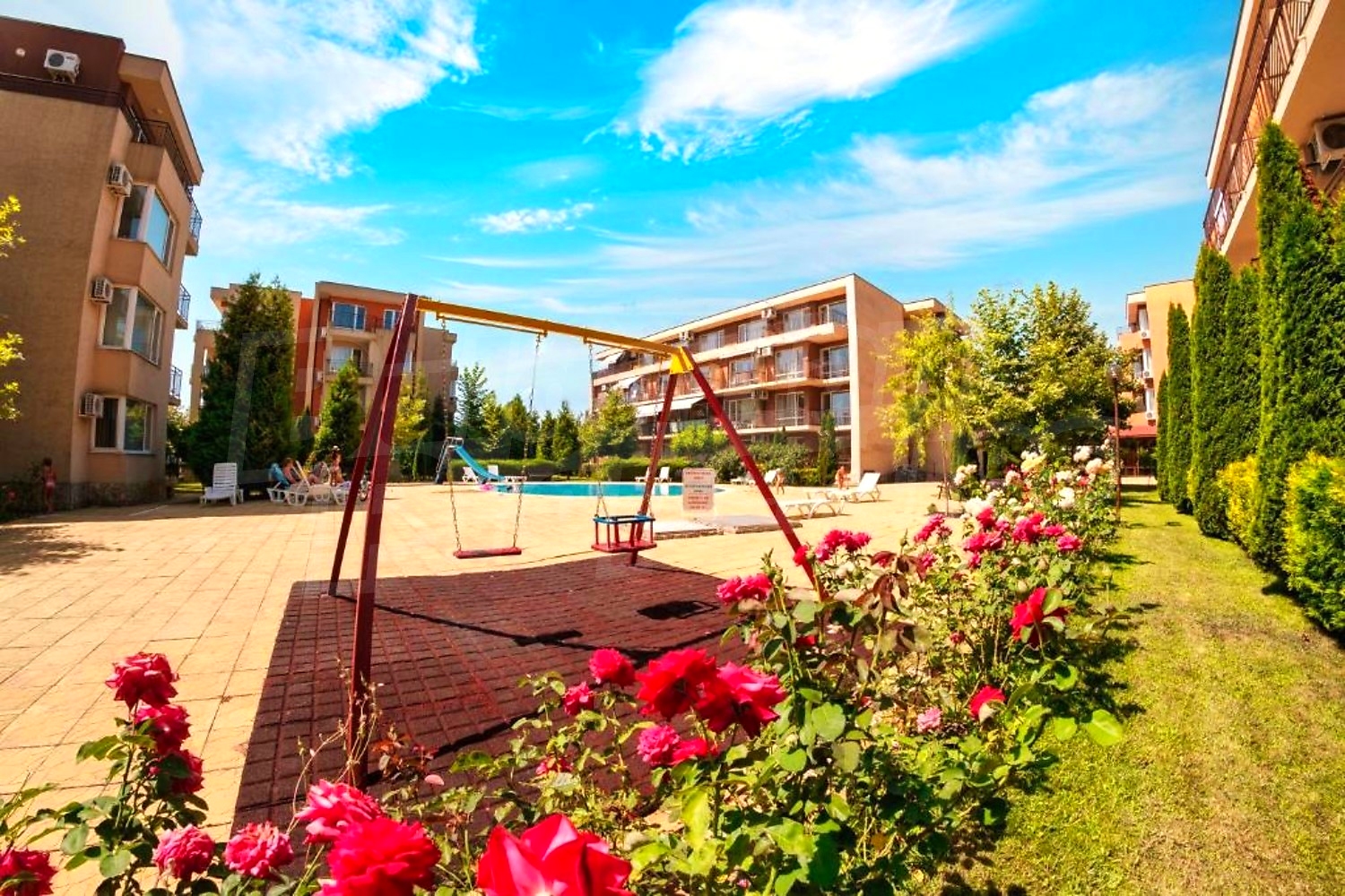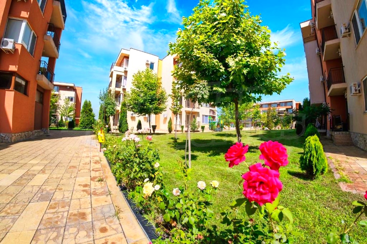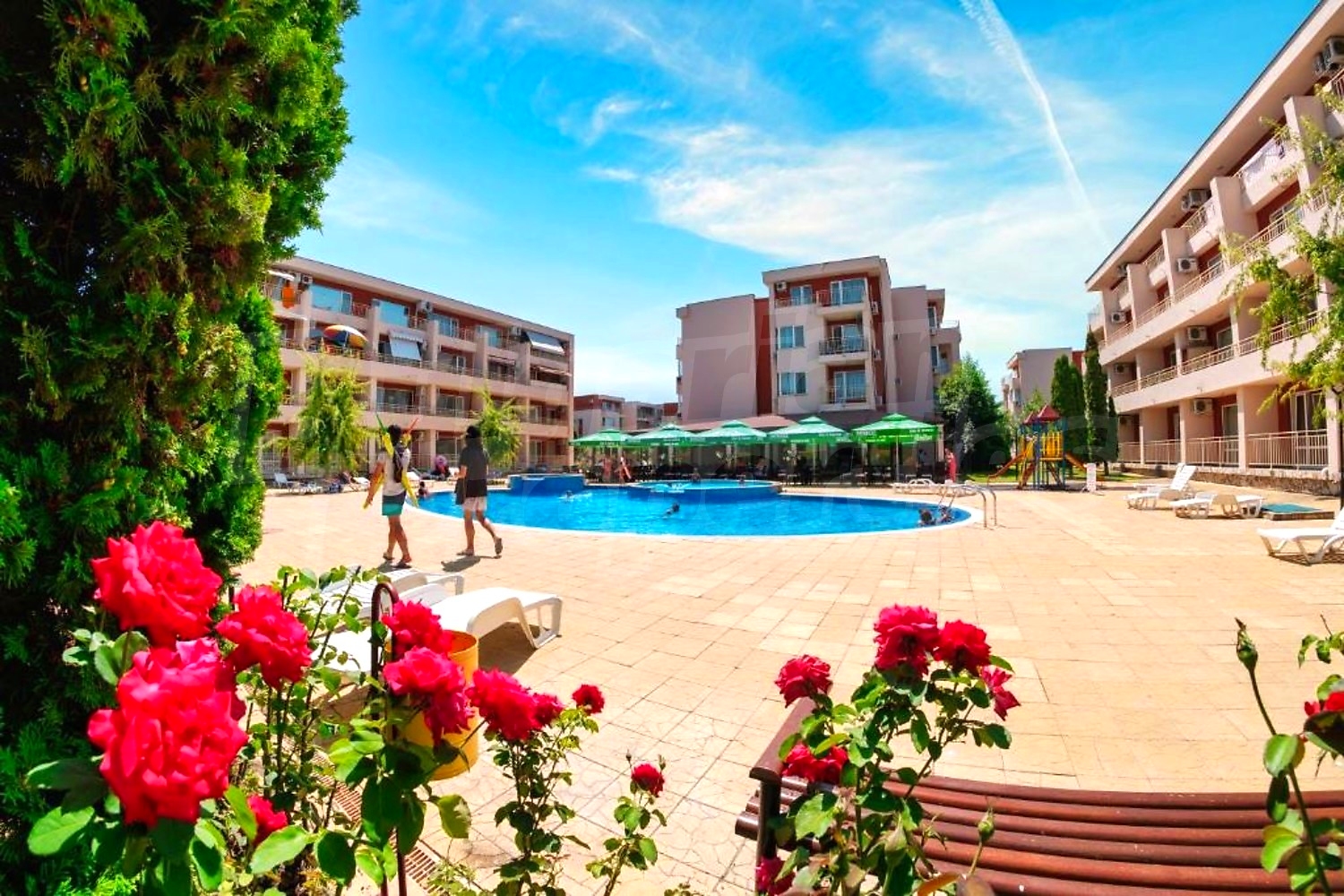 The complex is gated, with spacious landscaped areas and year-round maintenance. It is located in a quiet area outside the busy centre of the resort, on the main Burgas–Varna road, about 12 minutes’ walk from the beach and close to Action Aquapark and tennis courts.
