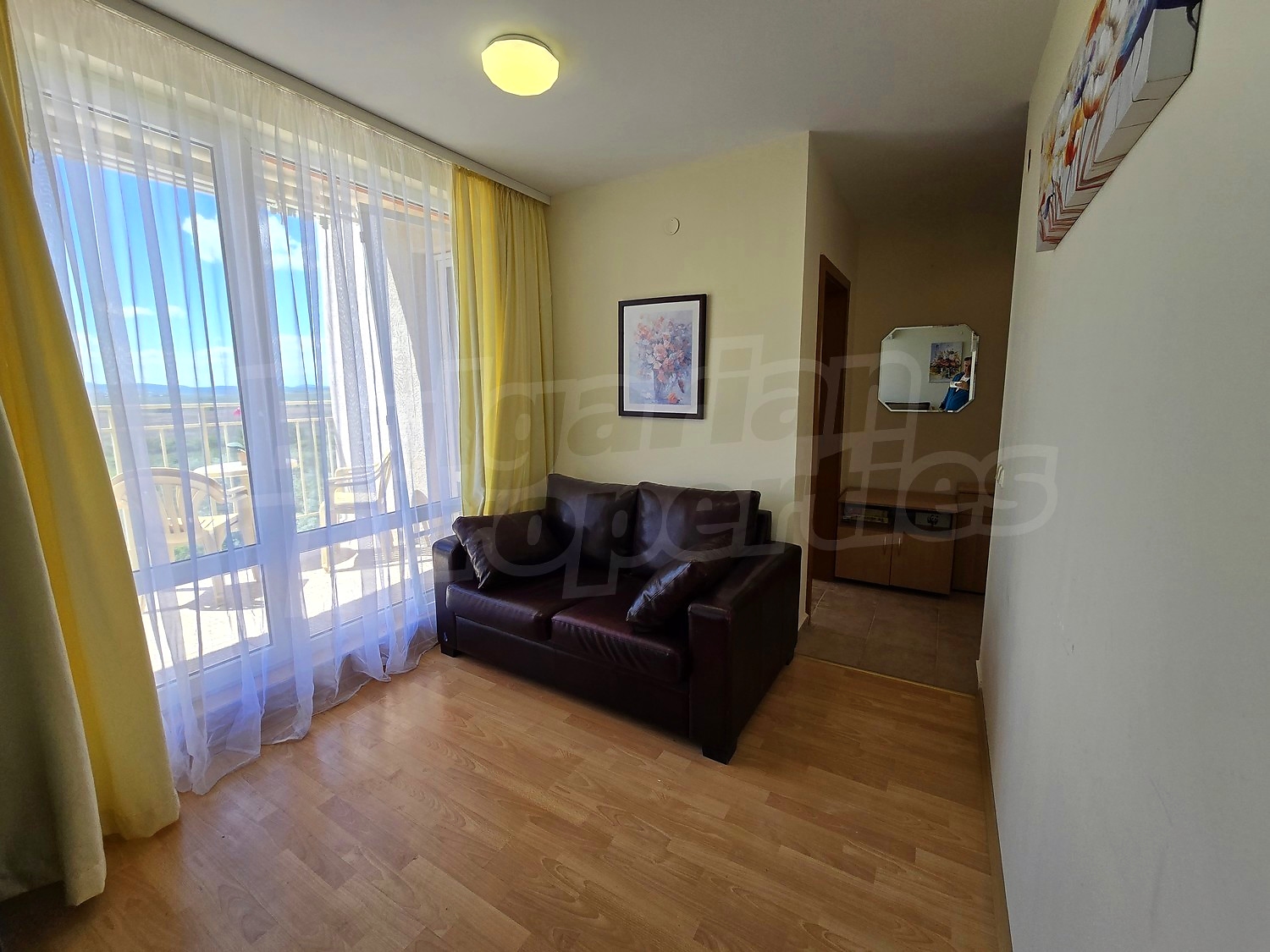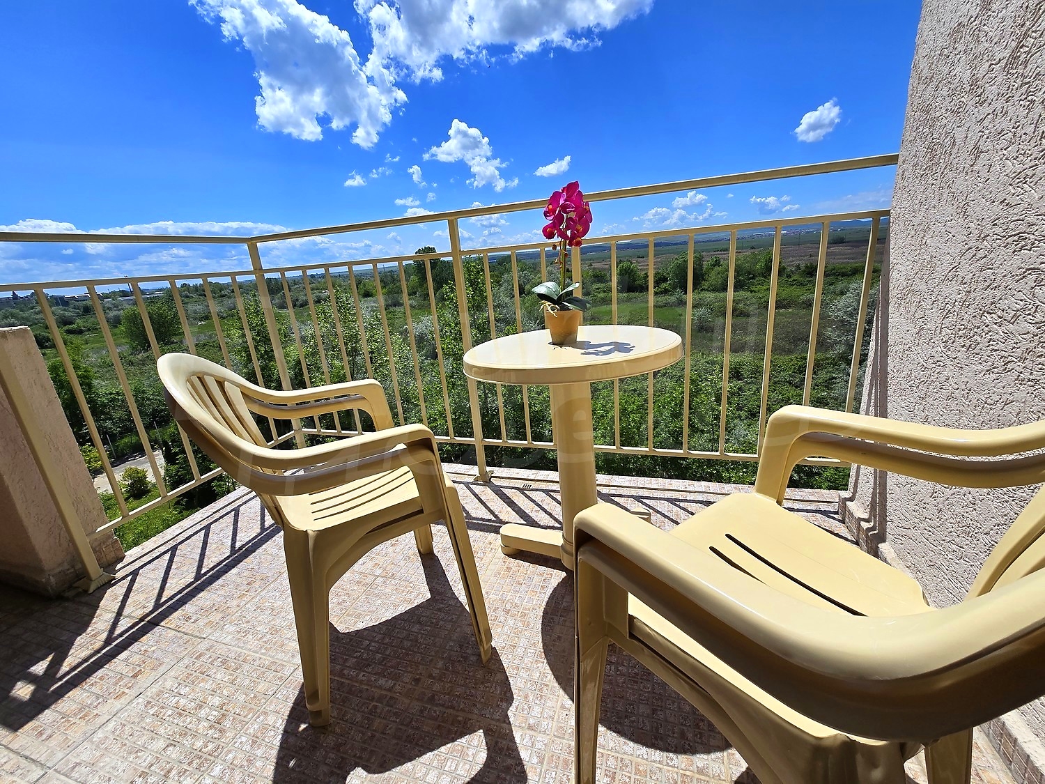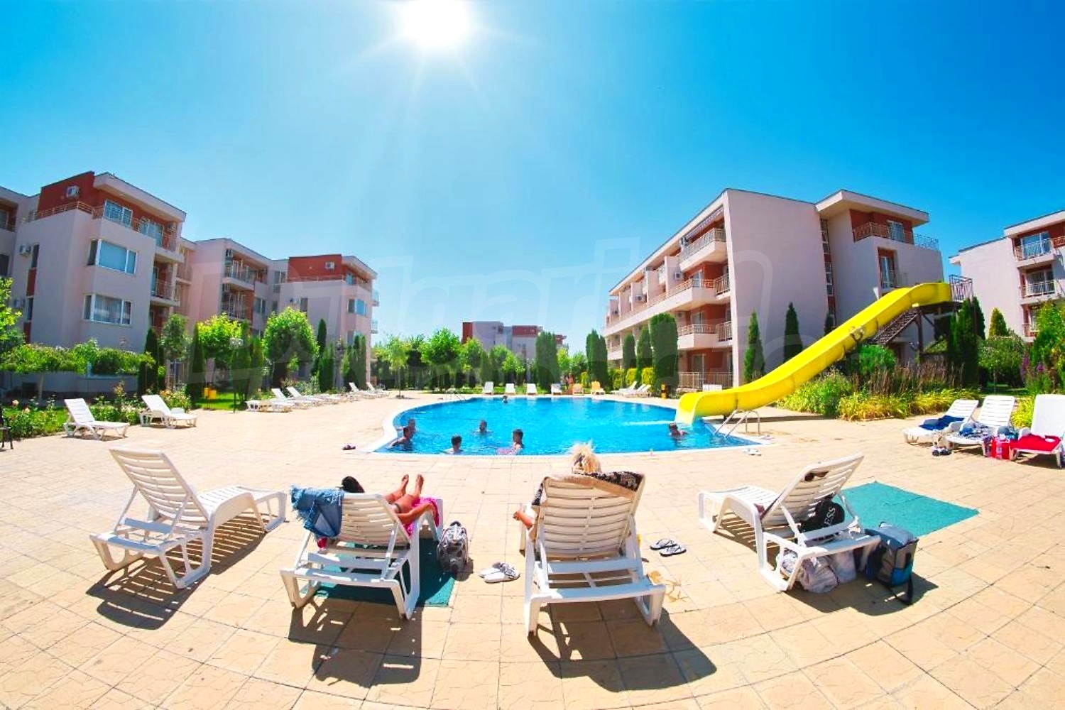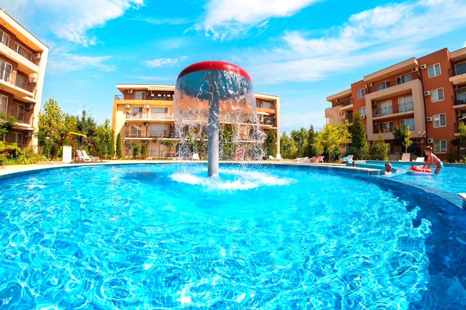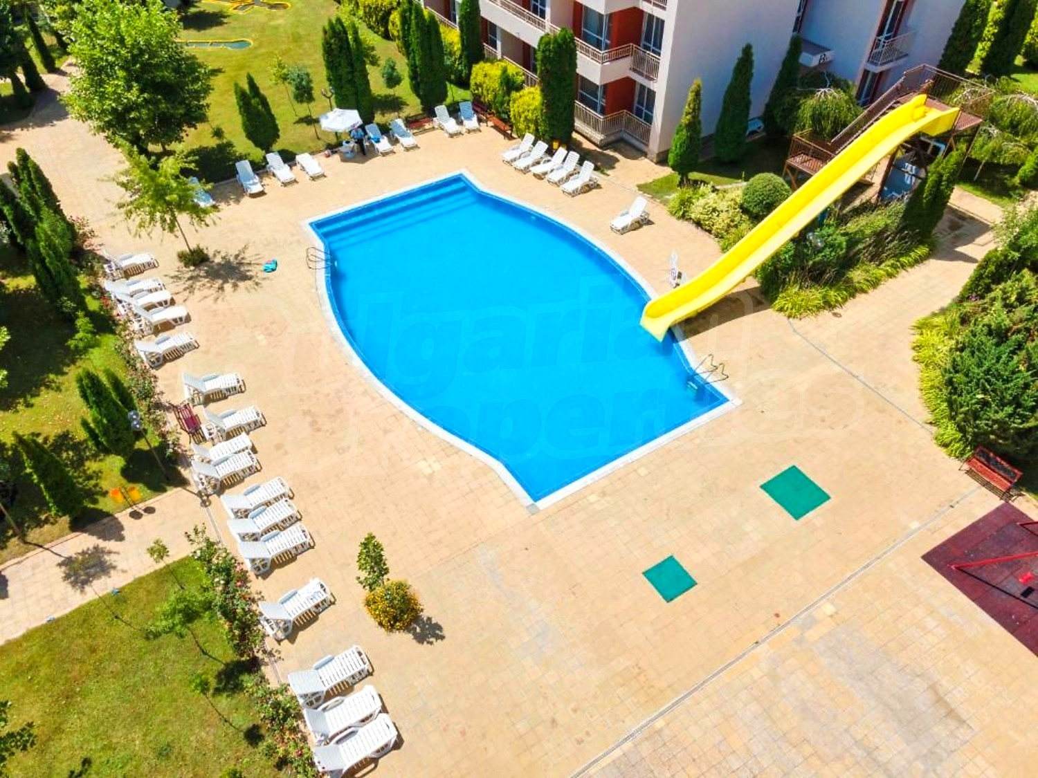 The complex is gated, with spacious landscaped areas and year-round maintenance. It is located in a quiet area outside the busy centre of the resort, on the main Burgas–Varna road, about 12 minutes’ walk from the beach and close to Action Aquapark and tennis courts.