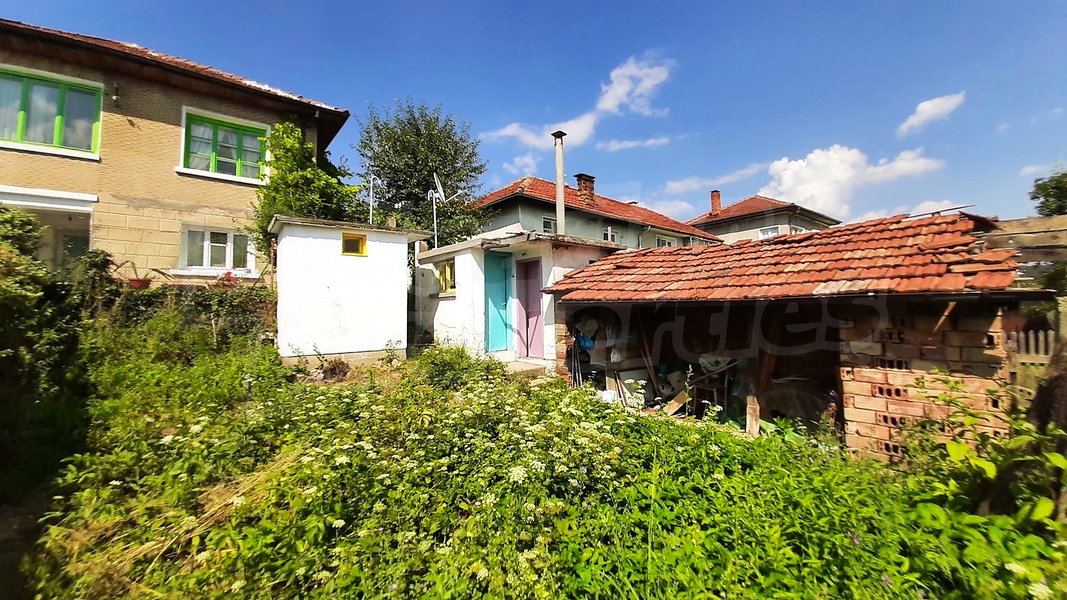 The yard is almost level, with a barely noticeable unevenness, and is suitable for a recreation area or a small vegetable garden.