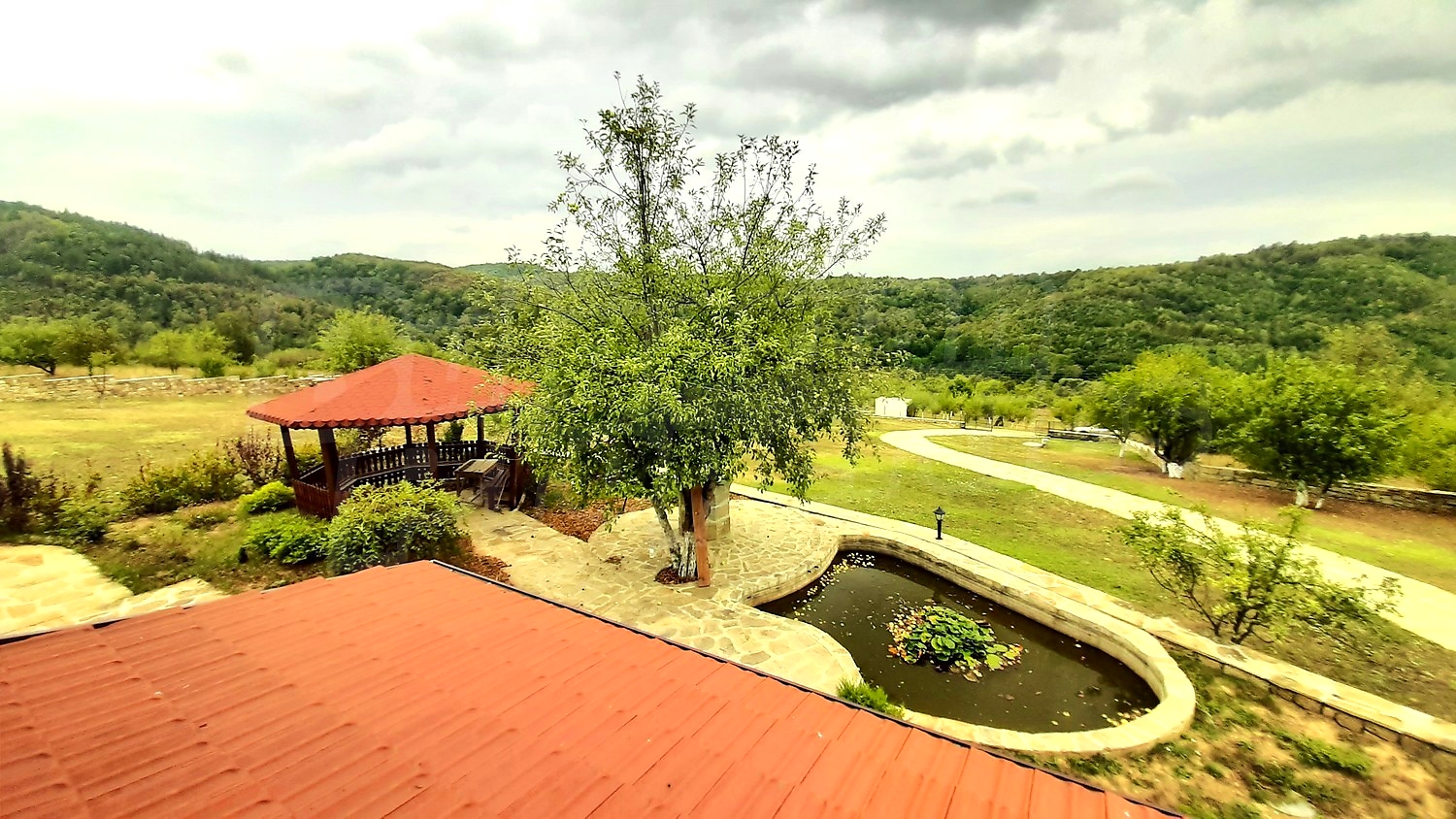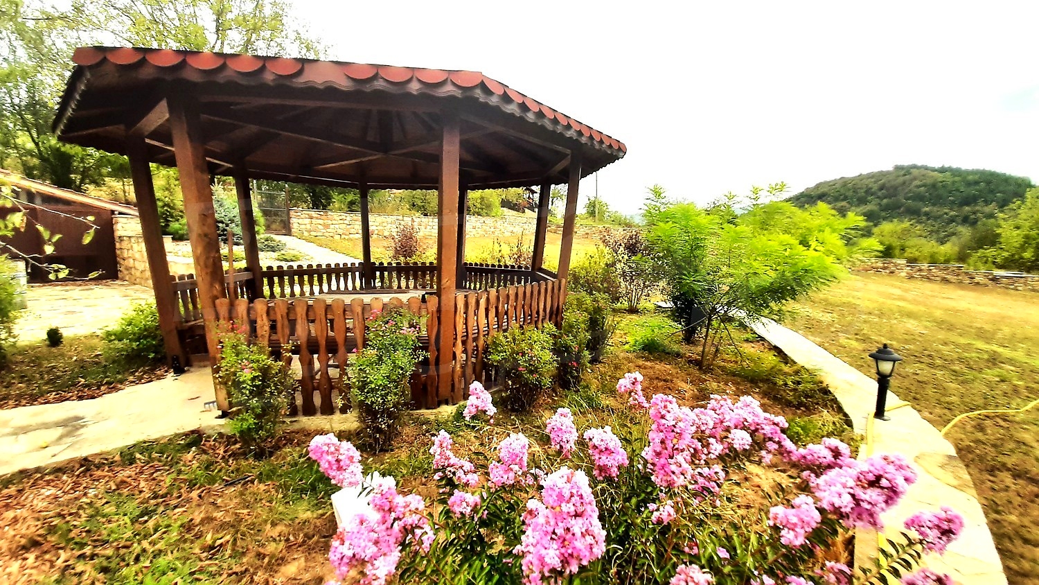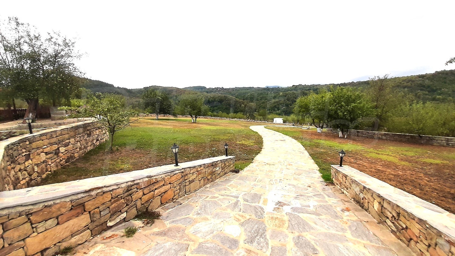 The garden, which is fully enclosed by a stone fence, is gently sloping, south-facing and offers beautiful mountain views. It is also excellently landscaped with separate seating areas, gazebo, small lake, barbecue area. There are playgrounds and paths with stone paving, garden lighting.