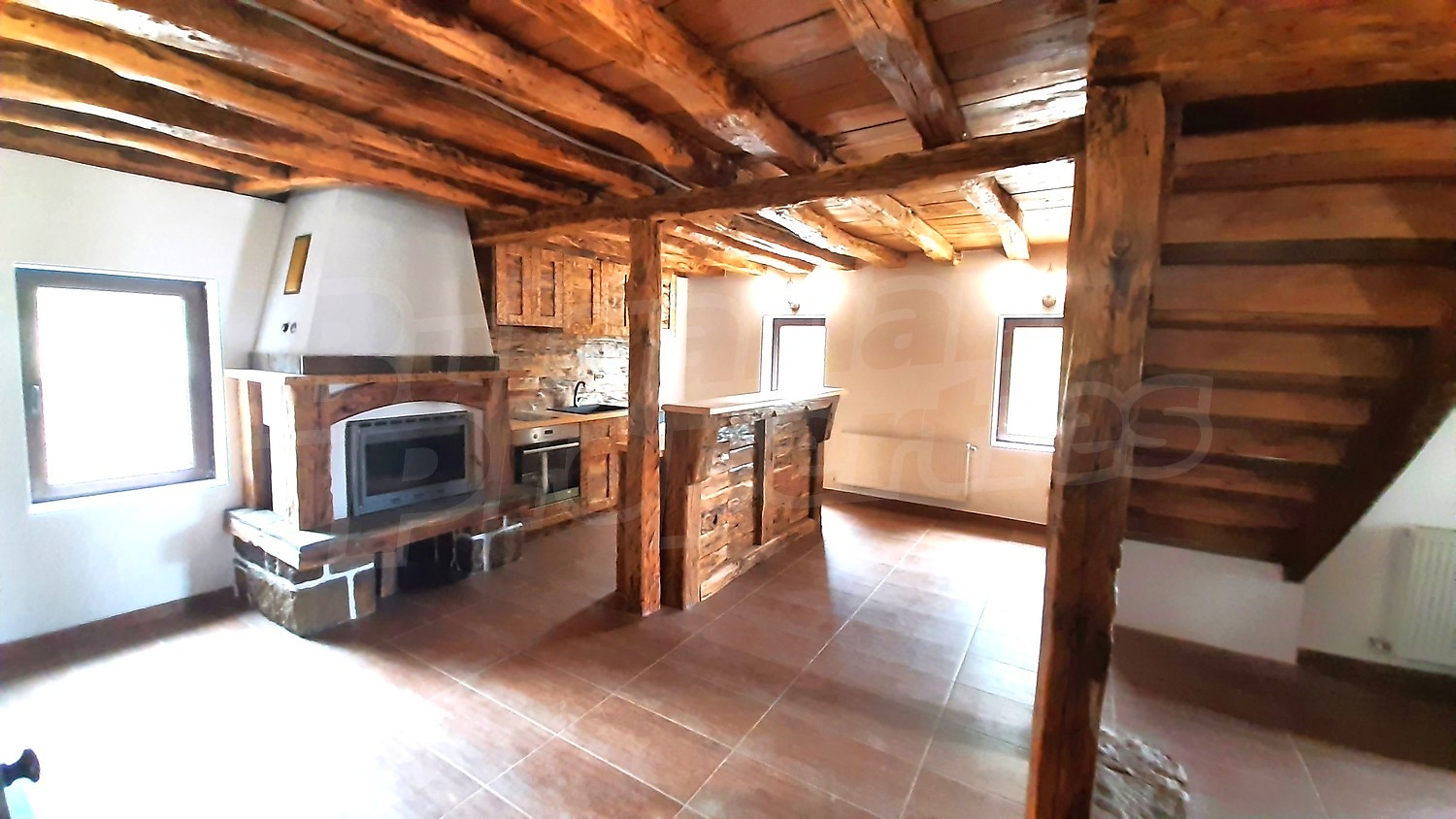 It is a two-storey house with stone foundations and beamed ceilings, with an area of 112 sq. m., a barbecue area of 60 sq. m., two covered parking spaces of 40 sq. m. and a lovely garden of 5314 sq. m. (of which 2832 sq. m. are urban area and 2482 sq. m. are agricultural land). The first floor consists of a living room with fireplace, with kitchenette and bathroom with toilet. A beautiful internal, wooden staircase leads to the second floor, where there are three separate bedrooms, a corridor and a terrace from which a breathtaking panorama can be enjoyed.