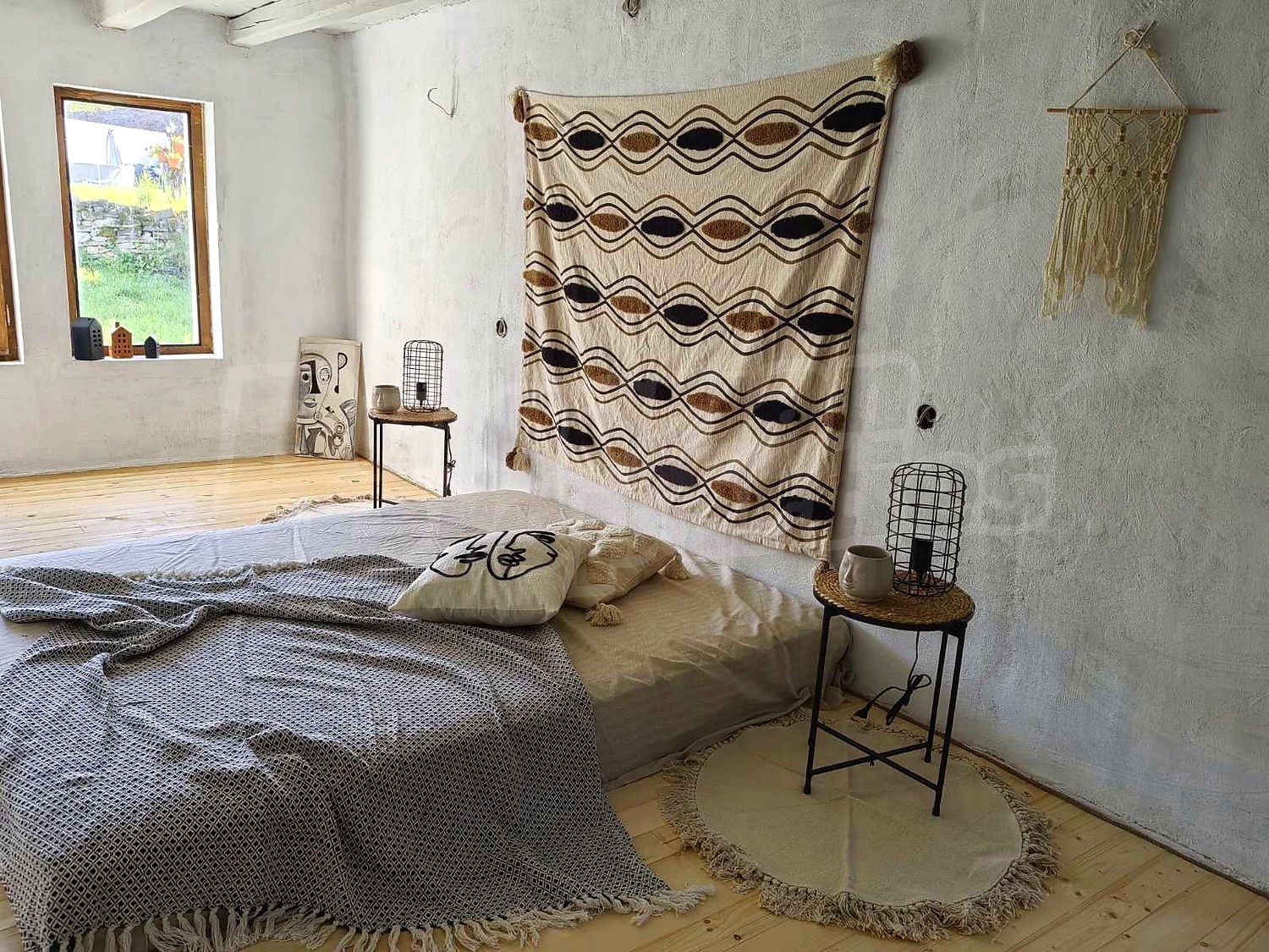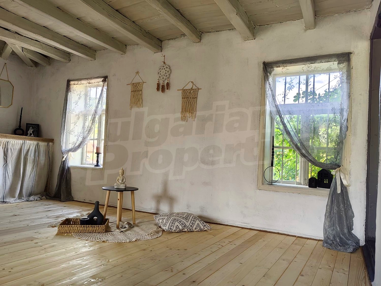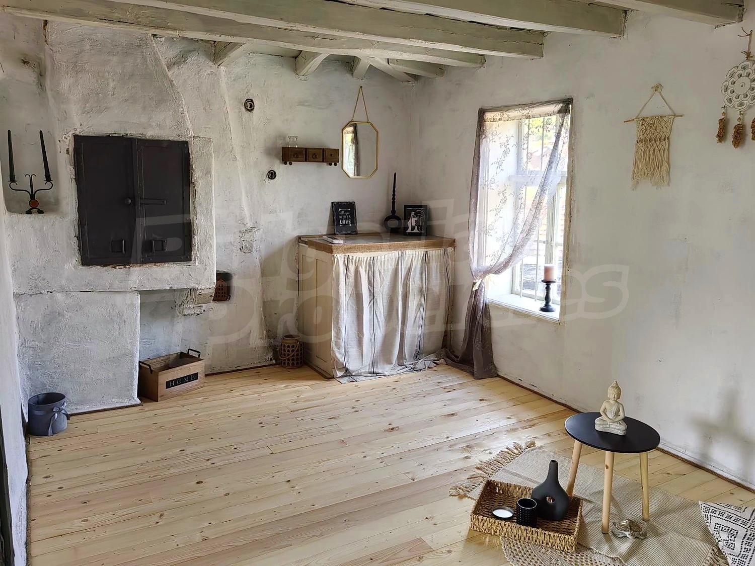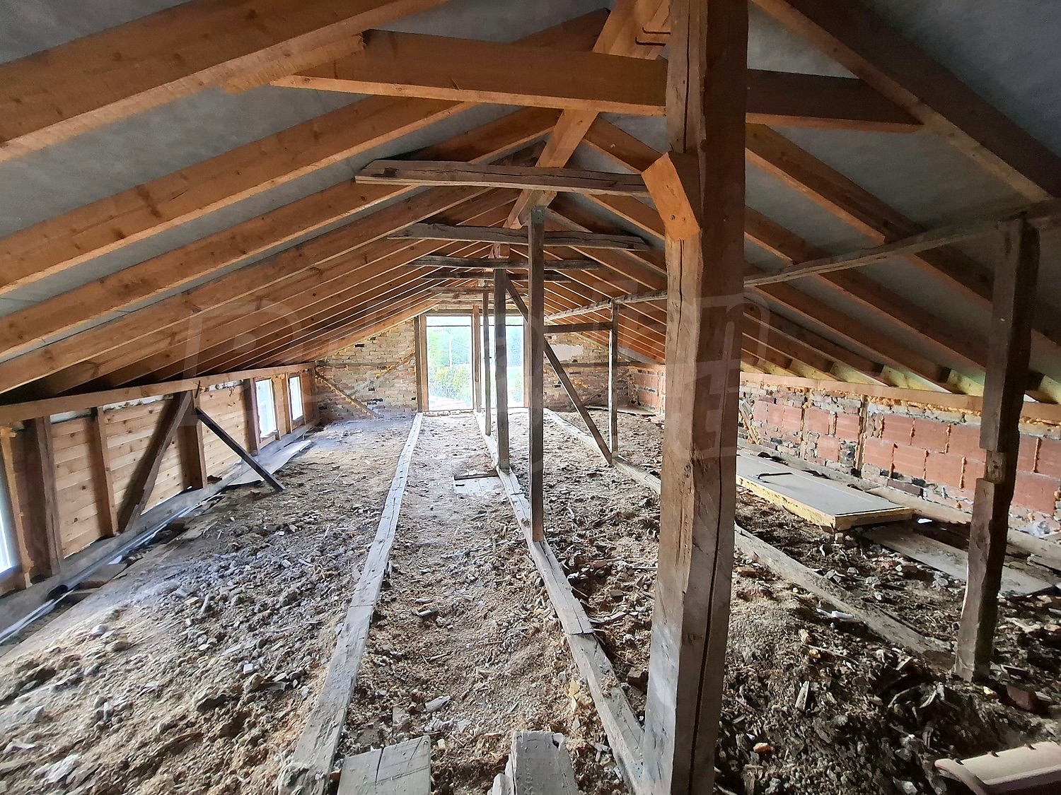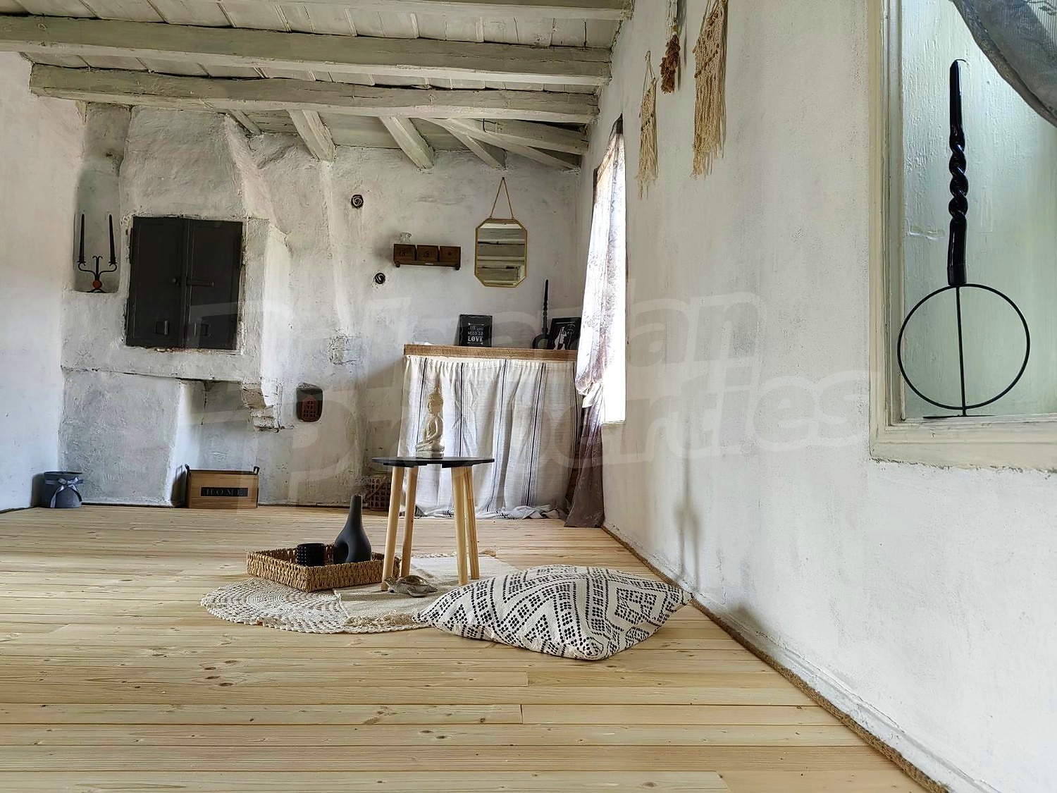 In the renovated part there is a living room with kitchen and dining area (one room), a bedroom, a bathroom and another room which is currently used as a dressing room and a place for light workouts. An internal wooden staircase leads to the attic space where one part has been shaped into a room with a bathroom and the other is unfinished. In this part, the windows have been replaced, new electrical and plumbing systems have been laid, the flooring has been laid in wooden flooring, laminate and granite tiles, internal and external insulation has been installed. Heating is provided by a wood burning fireplace with water jacket and radiators. A drainage system has been installed.